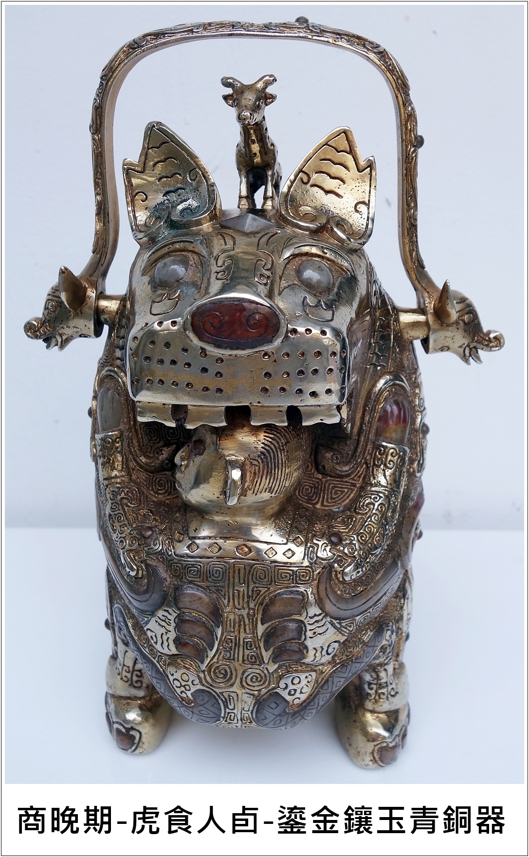 商晚期-虎食人卣-鎏金鑲玉青銅器