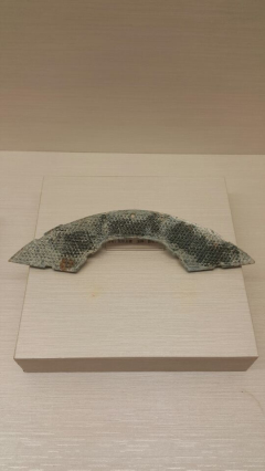 本館此和田青玉璜呈窄孤形,兩端稍寛、體扁薄、表面琢蒲紋、粿粒飽滿、兩端龍首形式,