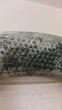 地子碾琢平整,璜周圍勾勒凹弦紋邊欗,中間打孔,供穿糸,該玉璜體型受泌後,