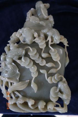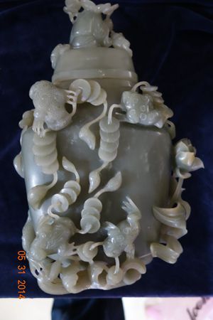 本件以青玉雕製而劉海戲金蟾玉瓶,造型華麗,整體高浮雕的劉海戲金蟾造形,