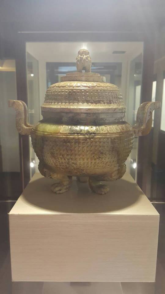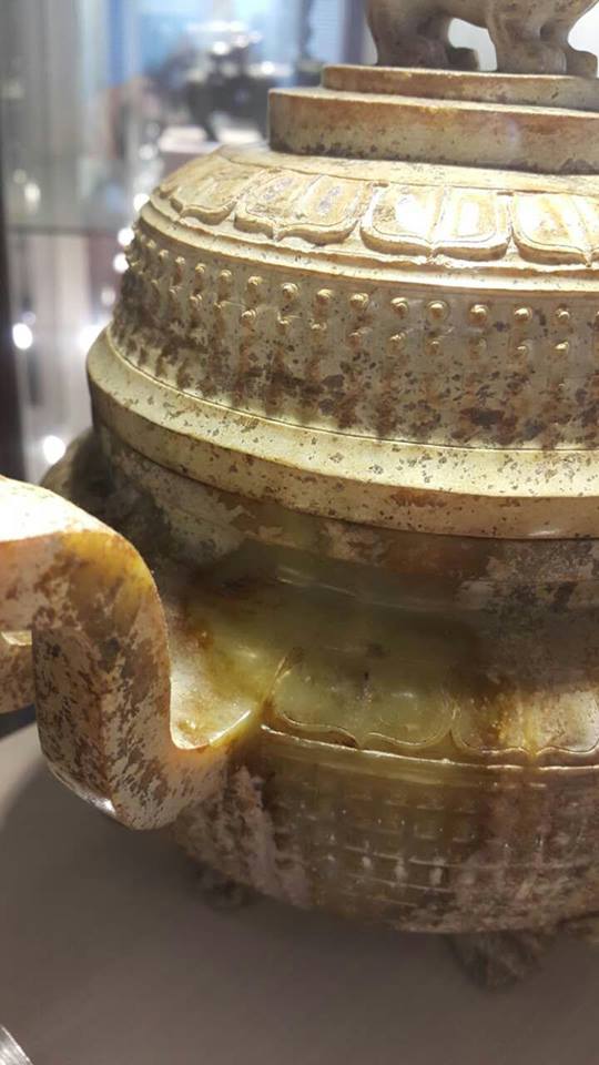 西漢-和田黃玉-三足双耳乳丁玉爐。