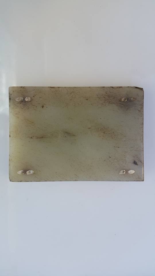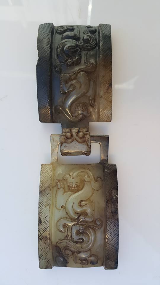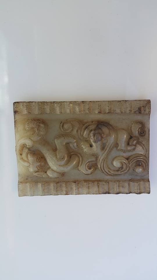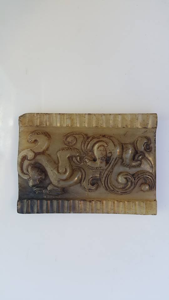 古代玉腰帶主要分為兩種、一種是上期本館介紹的全器玉腰帶、其以整塊玉料彫琢而成、每片玉塊間以活動連結方式、連成一條玉帶、本館今日介紹的是以單片彫琢紋飾背面鑽有四孔可穿線于緞帶上、在兩端彫有全玉琢成的玉帶鈎、以利緊扣功能、更增加其美觀和實用、此種腰帶玉飾片在出土的資料中明顯較多、應是較受古代貴族們喜愛。