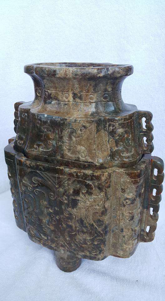 方彝是西周盛行的盛酒器、大多以青銅器制成、彝本來是所有禮器的通稱、可是方彝不同、它是指高方身、帶蓋的盛酒器、方彝蓋上有鈕、蓋和鈕形狀像屋頂、有的方彝上面還有觚稜、腹有直的、有曲的、有的在腹旁還有兩耳、工藝較復雜、至東周時期玉彫工藝大有進步、玉方彝就在當時己出現、本館展出這件三足方彝的盛酒器、從工藝、紋飾及古僕的神態、應是春秋時期貴族的盛酒用具。