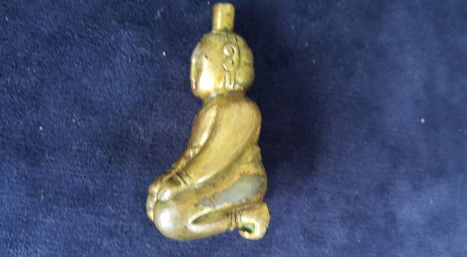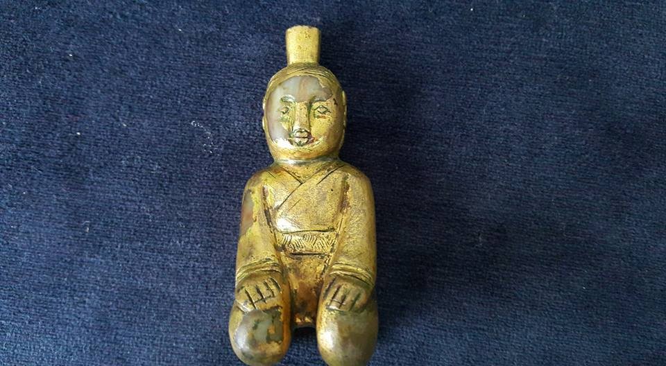 古僕神韻、線條流暢、玉窗的土泌包漿温潤、加上其全身金光閃爍、更突顯古代帝王陵寢的豪氣。