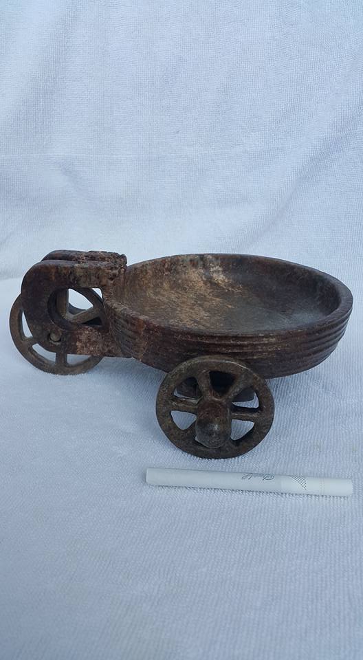 這件玉器、其形制、尤其刻紋仍然因襲春秋時期風格、此形制青銅器在吳國地區曾出士過、而吳國到戰國時代歸屬于楚為楚文化系統、而以這物件整體結構來看、己經明顯表現了重大改變、將原用于擺飾和祭祀的器皿、更趨向於實用方面、從這件双獸繩紋三輪盤、即令人有這種直接而明顯的感覺。