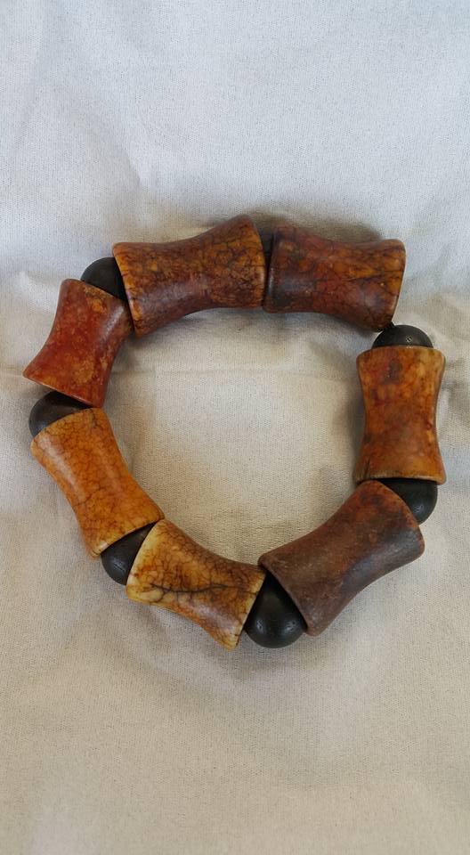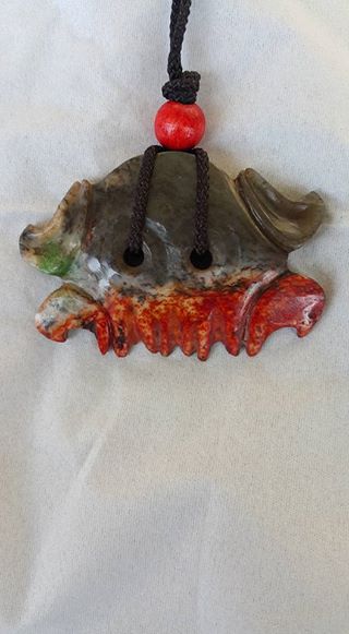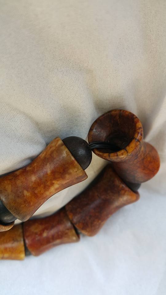 早期紅山先人琢玉用手工以堅硬小石片再利用現今俗稱、、金鋼沙、、合水作煤介而琢磨之、固使完成之物件備感靈氣和古僕、其特徵是圆不圓、直不直、平不平、並可在琢磨紋飾上、清楚看到其粗擴的琢痕、讓喜歡紅山玉器的同好、有種、原始、僕實和柔和之感、今展出這兩件勾雲形器和珠練上就可看到其風格。