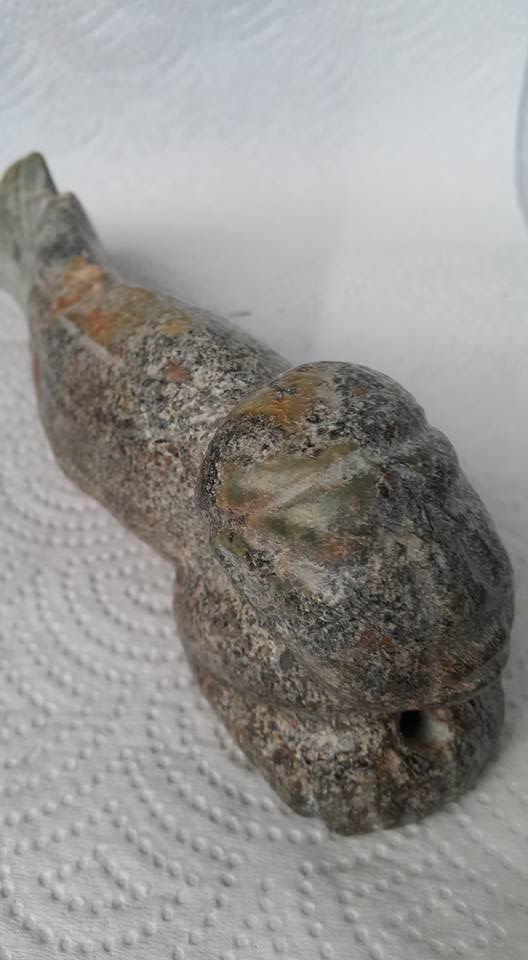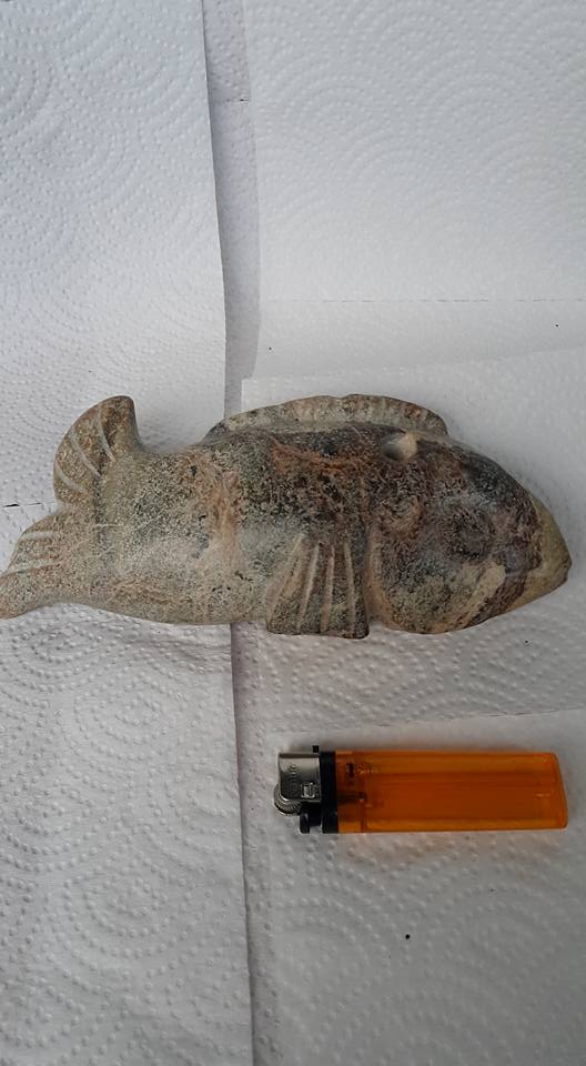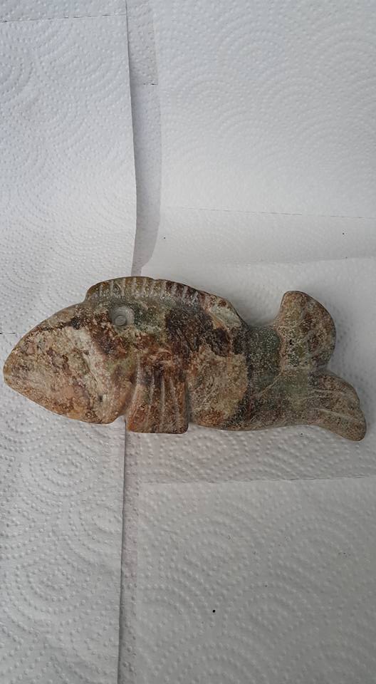 在新石器時代的早期至晚期間、先民們較喜歡用飛禽走獸作為崇拜和仿形憶造之彫塑題材、但魚類造型較少出現、本館今特挑出兩件紅山文化時代的鱼類器形、其中一件是人首、鳥身、獸腳、鱼尾、的器形十分奇特、這多種動物特徵為一体的物件、常見於春秋以前至商周較多、史前文化時期以二種物体合体較多、像這美人魚形器的多種組合、尚屬少見。