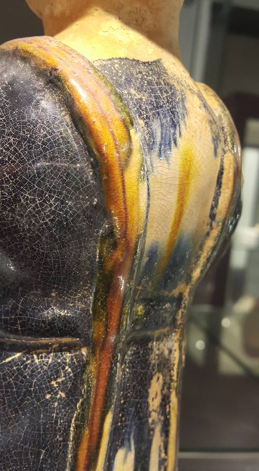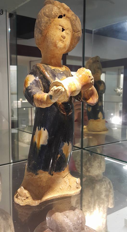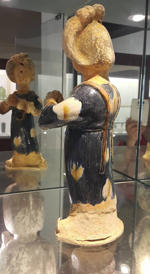 唐三彩中的樂女是唐代文物中的典型器、其具有唐代特色的豐碩體態是最大特色、而那以藍、褐、赭黄三色為主、唐三彩的色釉有濃淡變化、互相浸潤、斑駁淋漓的效果、在色彩的相互輝映中、顯出堂皇富麗的藝術魅力、本館今展出這件、樂女、通高6O幾公分、臉份雖然有点殘缺、但從整體的唐代胖妞韻味、還是亭亭立玉、悠然嫻雅。