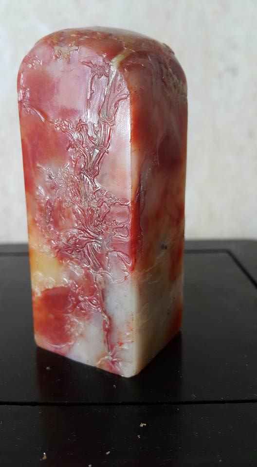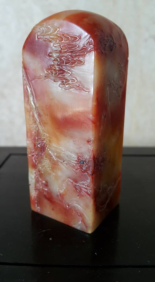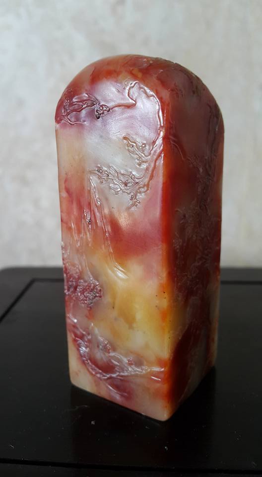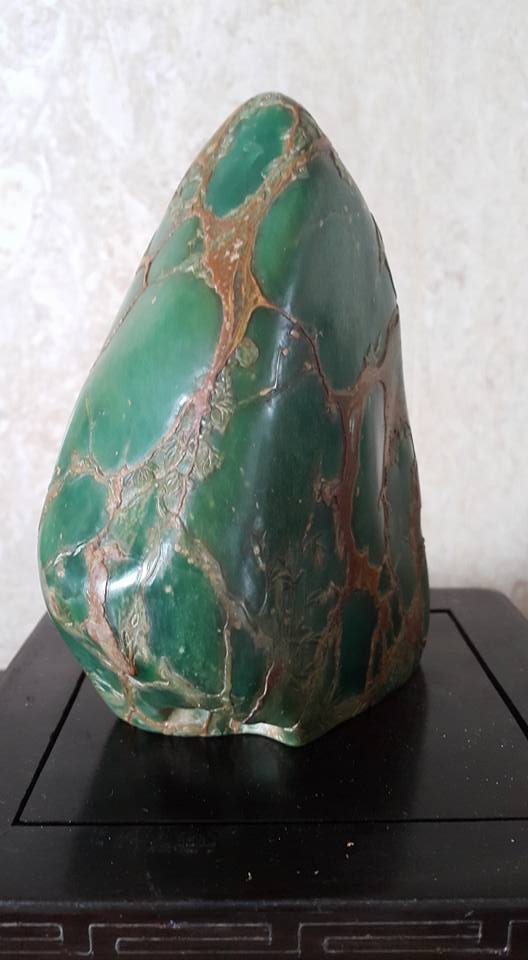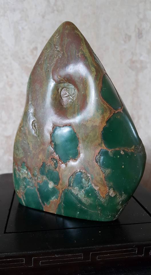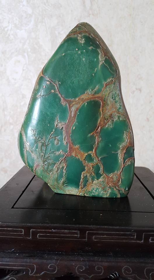 廣東綠、屬雲母玉中的一種、是中國五大名石之一、其種類有6O幾種、其中以金星綠凍和藍天凍最為高等、但已絕產、本藏品于一九八六年在杭州某國营藝術研究所中獲得、其物件外面佈滿金色皮殼所巧彫的文飾、巧夺天工、是件難得珍品、、芙蓉石藝彫、也是同時在該所獲得、此件工藝是該所副所長之傑作、原作為館藏品、經本館多方努力、才得到割愛、從那整体物件的文飾佈局和工法、不難看出有大師級的工藝水平、、本館這兩件奇石藝彫、取材上乘、加上文飾佈局大器和彫工精碪、可稱的上是近代文物之範例、提供大家共賞。