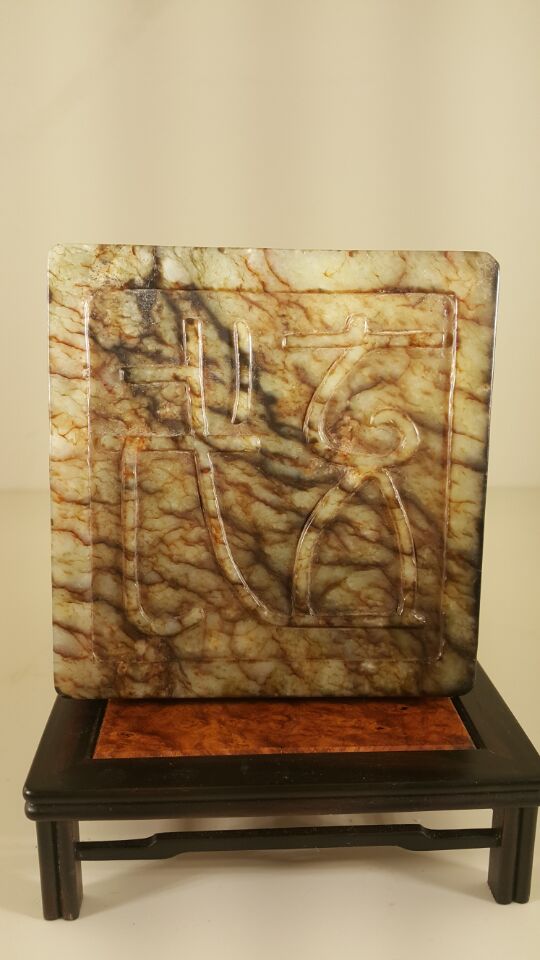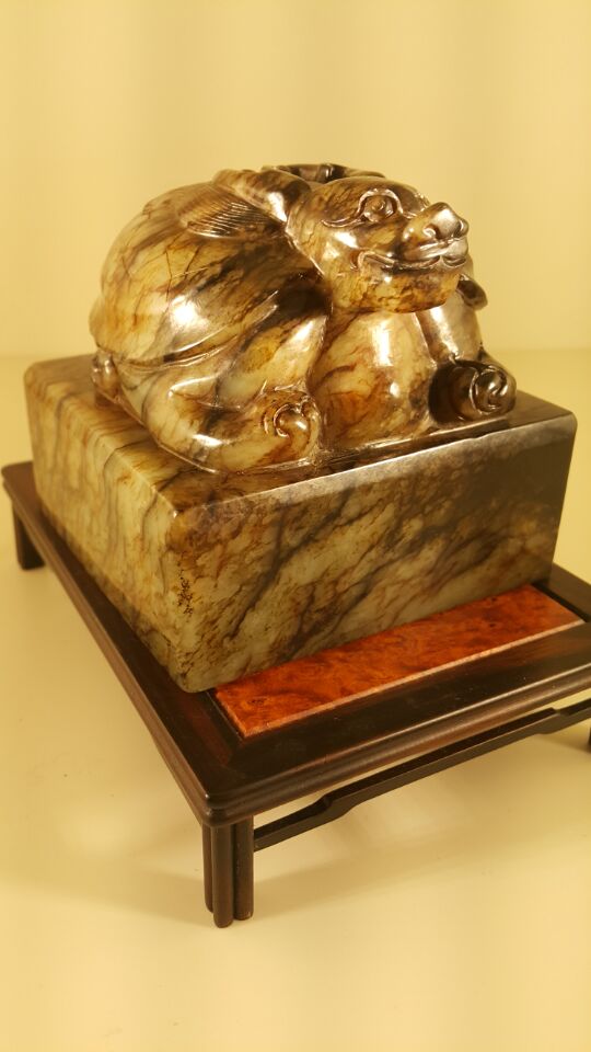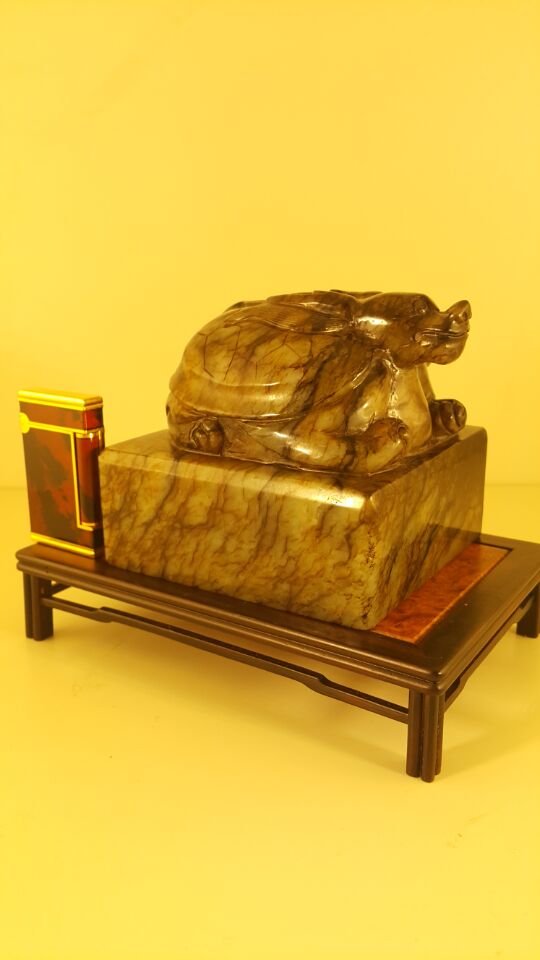 玄武是一種由龜和蛇組合而成的一種靈物,玄武的本意就是玄冥,武和冥,古音是相通的。玄、是黑的意思。冥、就是陰的意思。玄冥起初是對龜卜的形容,龜背是黑色的,龜卜就是請龜到冥間去詣問祖先,將答案帶回來,以卜兆的形式顯答世人。因此,最早的玄武就是烏龜,以後玄冥的含義不斷擴大,龜生活在江河湖海,因此玄冥成了水神,烏龜長寿,玄冥成了長生不老的象徵。最初的冥間在北方,殷商的甲骨占卜即,其卜即北向,所以玄冥又成了北方神,故有青龍屬東方神,白虎為西方神,朱雀是南方神,而玄武就是那北方神了,古代重要殿堂和陵墓常設此四大神獸,本館這件玄武玉印以和田白玉彫琢置于墓中,可見陵寢主人之地位。