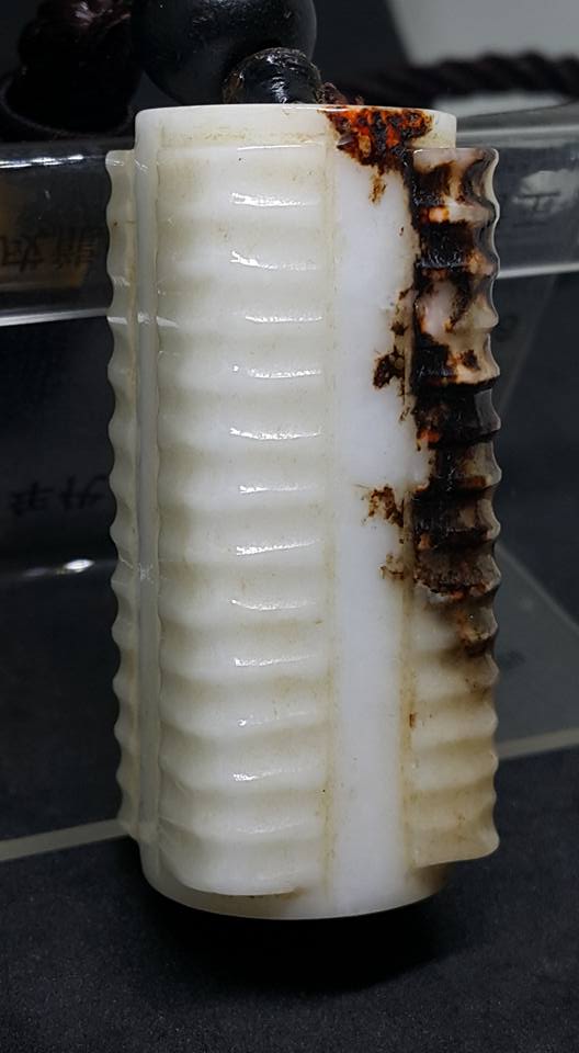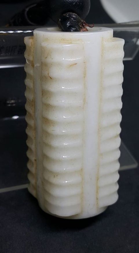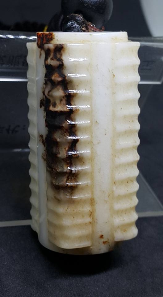 此件通高5公分並彫琢12節形飾的小玉琮、從形和琢痕判斷、