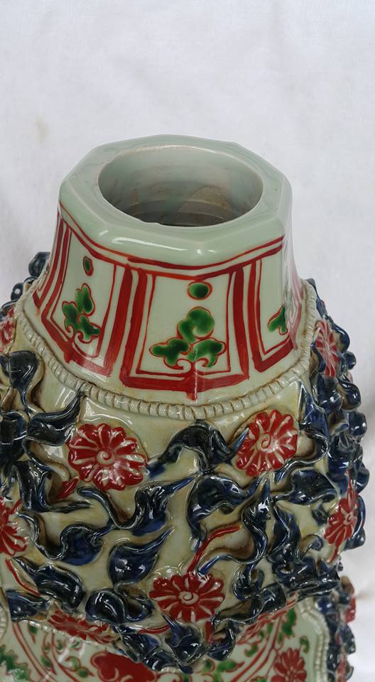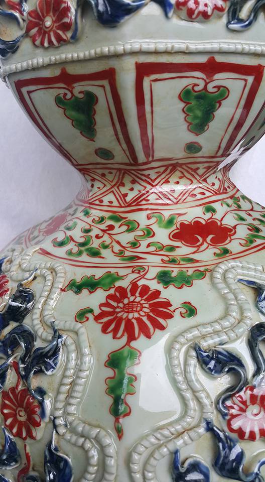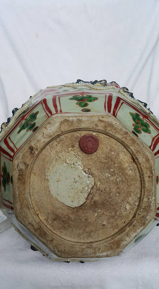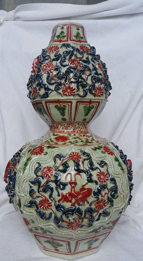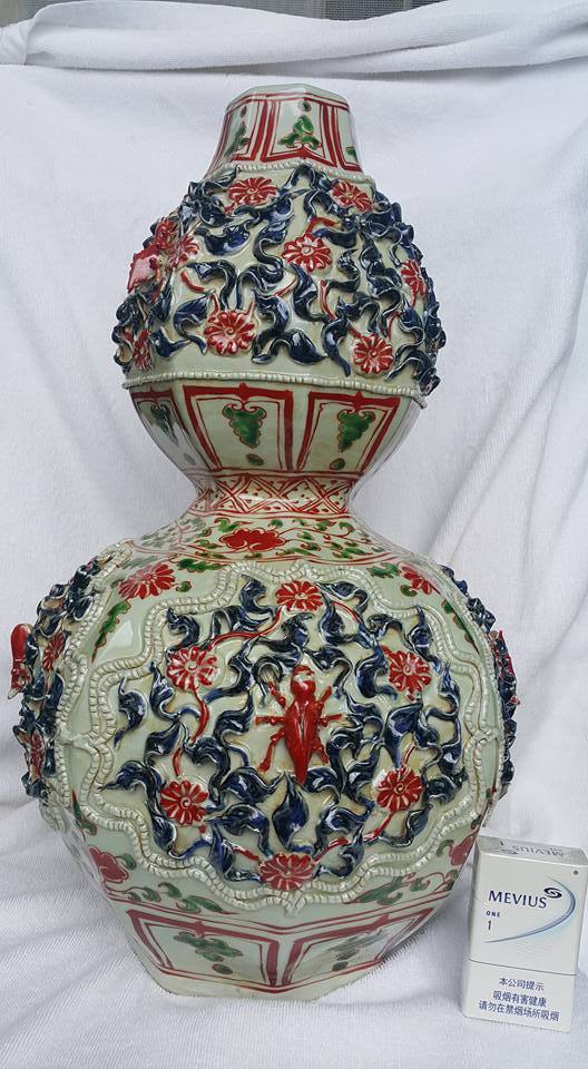 本館有幸從藏犮手中得此件通高5O公分的元代八稜揑瓷五彩葫蘆瓶、其瓶底印有、、