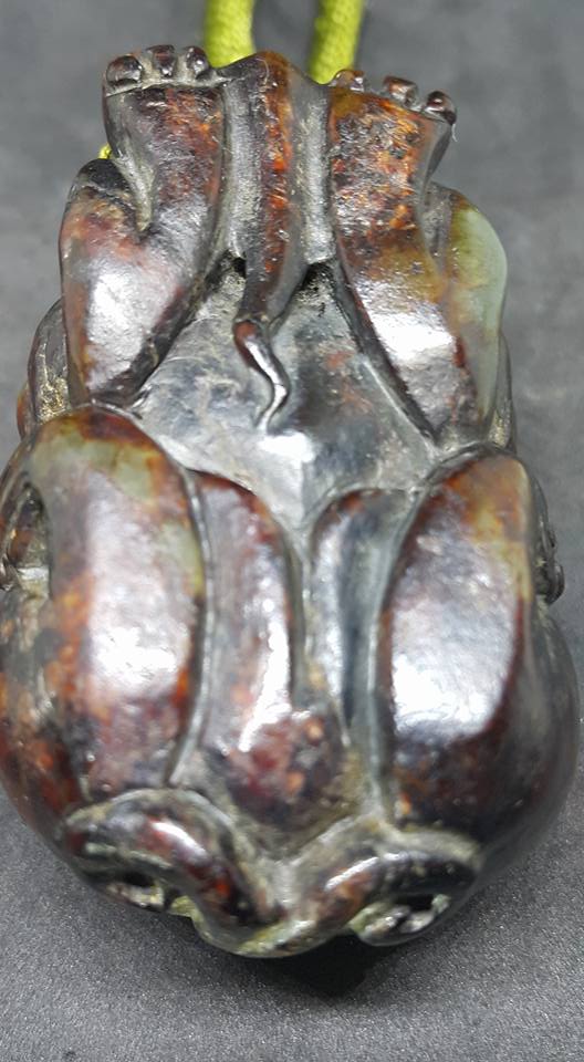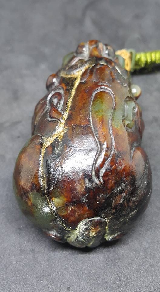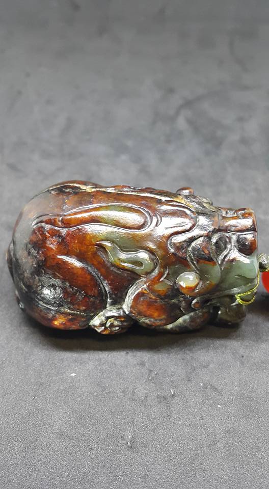 此件以和田籽料彫琢而成的玉獸、全器幾近滿土泌、從少部的玉窗漏出細緻玉質和那渾厚包漿、