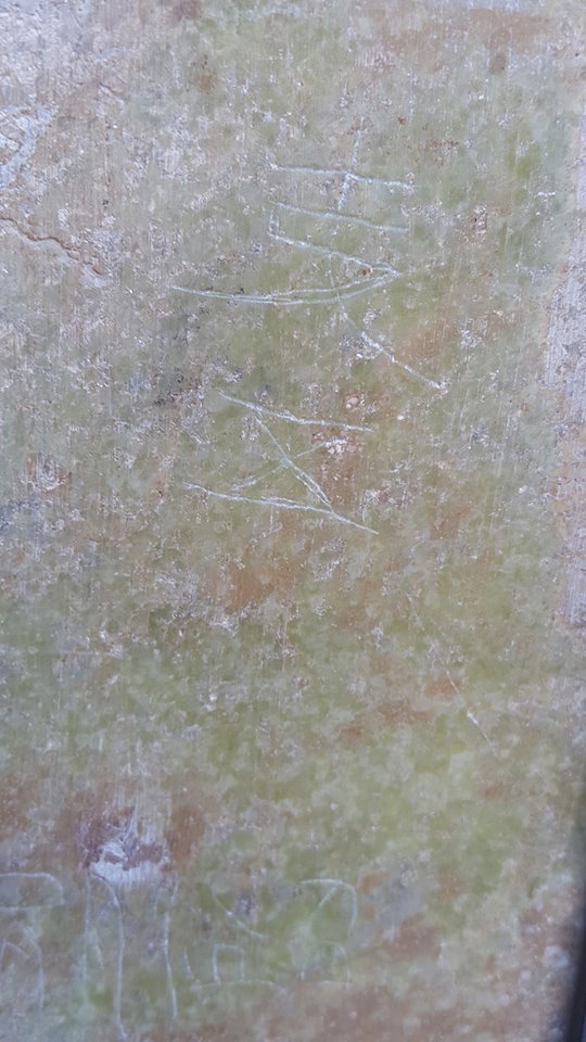 此件古玉牌、其兩面所展現的古文字和文飾、都以刻劃式工法來看、應是黄河流域文化陰雕紋飾的始祖、