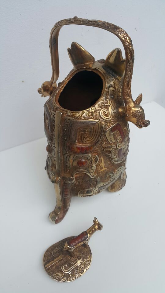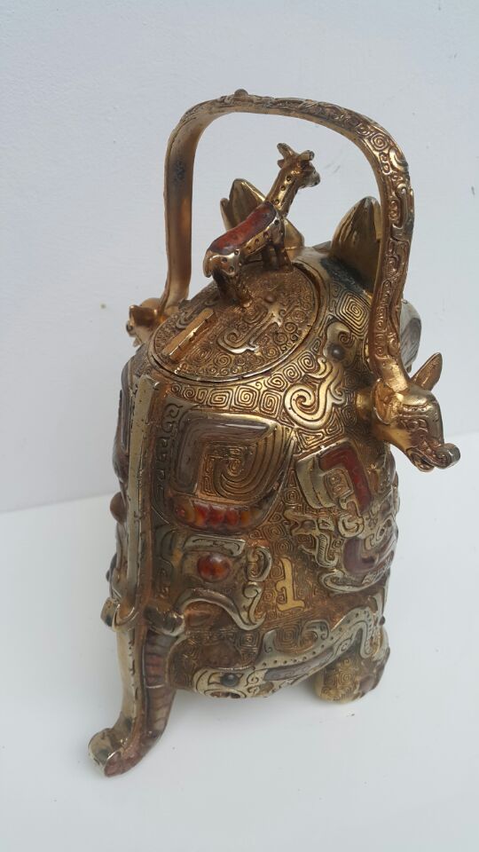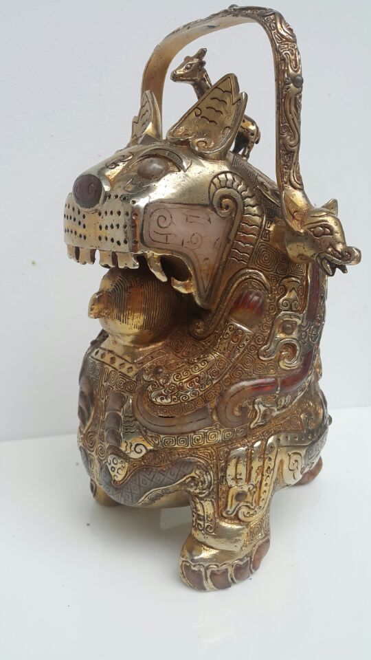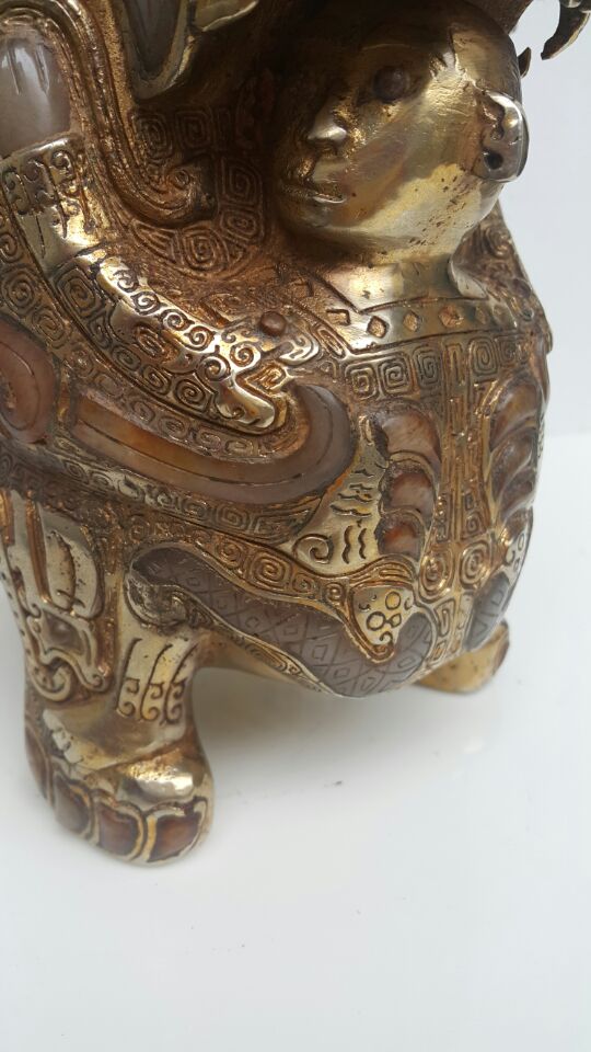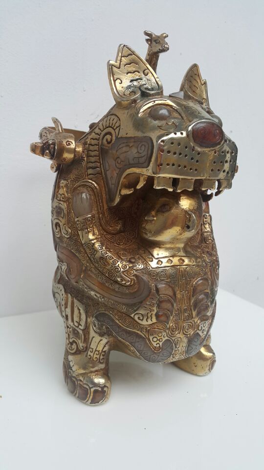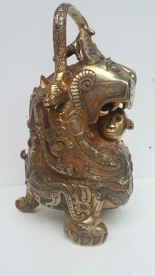 商晚期、、虎食人卣、、鎏金鑲玉青銅器、………………虎食人卣乃商周時期的一種青銅器、也是一種盛酒器、目前在世界各大博物館中、僅巴黎賽努施基博物館、和日本泉屋博物館各藏一件、並被尊為鎭館之寶。……而在華夏青銅器中、為何虎食人卣存世稀少、並受文物界尊崇、我們可從其整器工藝的複雜性和那描述老虎吃人的情景、前腳上方有一個人形抱住虎身、虎口大開、似隨時可將人頭吞噬、在那頸背有圓形的卣口、蓋子以一隻鹿作鈕、虎口上的門牙和犬齒掙獰、前腳利爪鮮明、一付兇狠模樣、其全身都飾滿夔龍文和饕餮文、更顯尊貴和霸氣。……在文獻上有許多對虎食人卣形態之詮釋、而本館以現代的文化背景來詮釋這虎食人卣、認為以大自然生物習性、此件虎食人卣的形態、應是表達虎對人的呵護之神情、我們可從虎和人的臉部來定論、因虎如要傷人、人是不會擁抱虎身、而從臉部也未流露驚恐之神情、可見、工匠設計之原意、應是表達虎護人之義含。……本館珍藏這件通高27公分、重3、07公斤的商代鎏金鑲玉虎食人卣、在商晚期出現、讓人稱奇、鎏金鑲玉之工法發現於春秋時期以後較多、像此虎食人卣器形複雜、在器物的異形條紋上饟玉、是極為精緻之工藝、比起流放到國外那兩件國寶級青銅虎食人卣的工藝和等級、應更上乘、可屬極品中的極品。