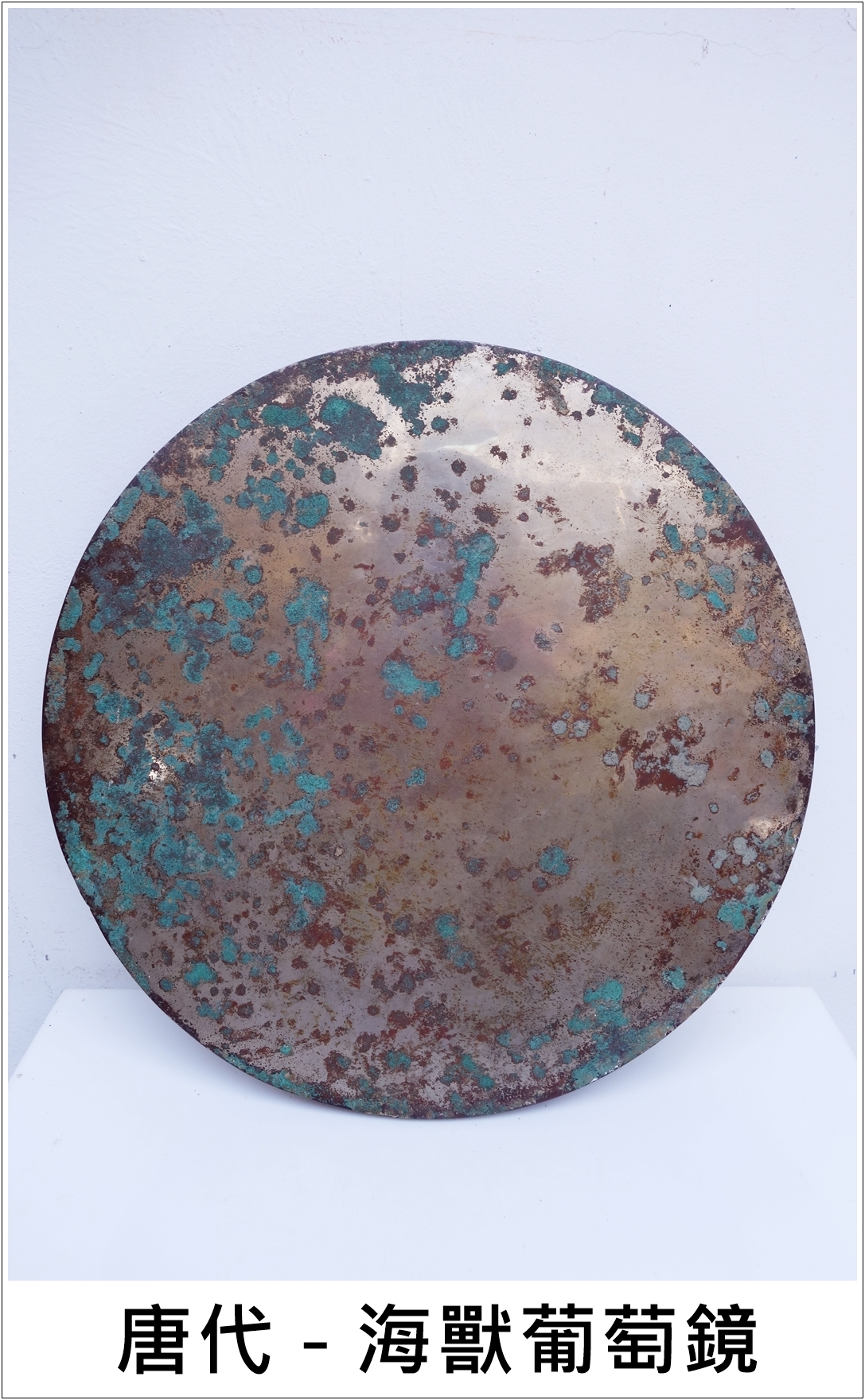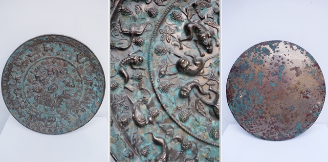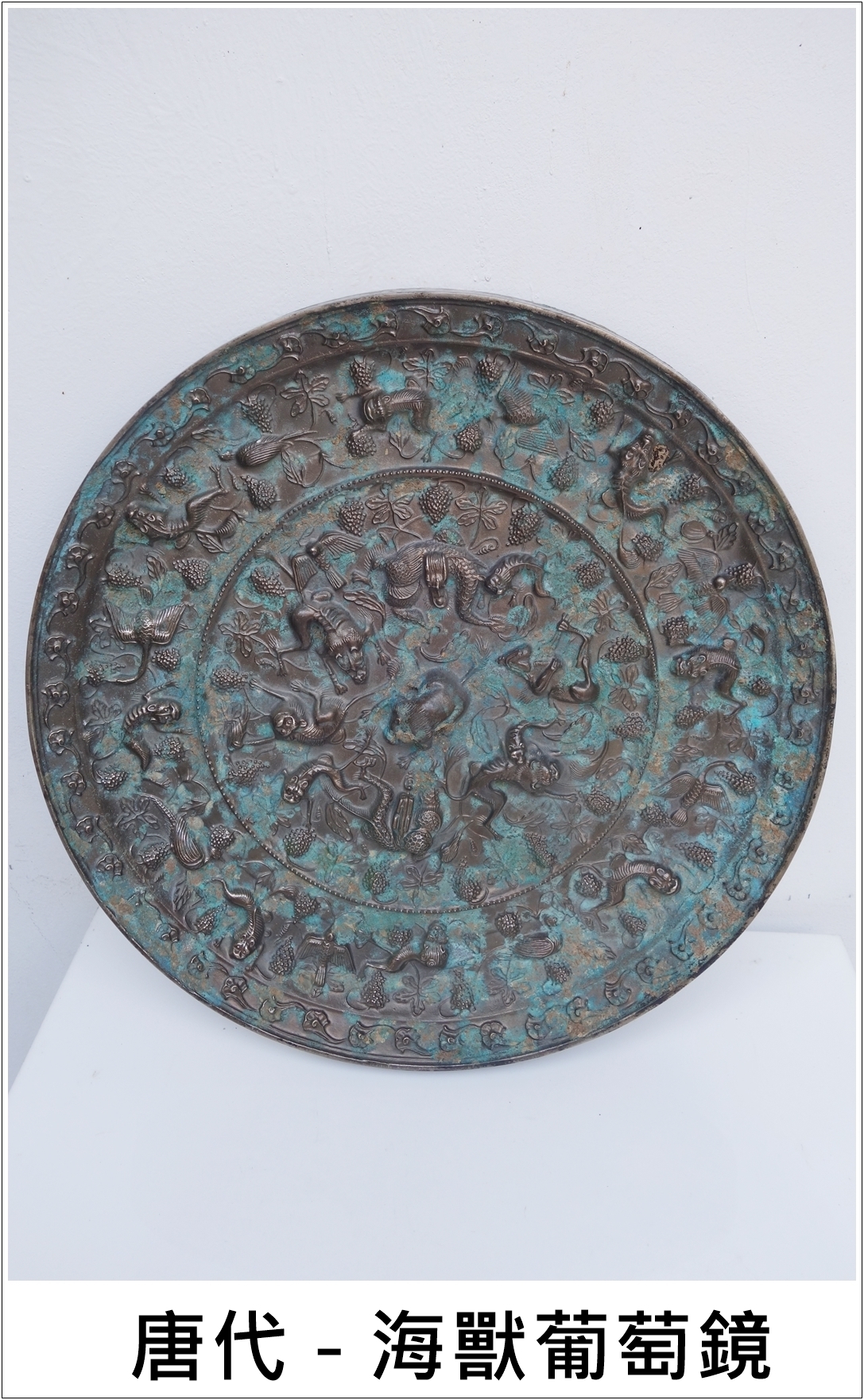 宋代以後,銅鏡製作漸漸衰落,逐漸被玻璃所取代,故留傳銅鏡工藝的精華時段應屬唐代。而唐代銅鏡的代表作應屬海獸葡萄鏡,本館有幸珍藏這件直徑38.5公分重達8.54公斤的海獸葡萄鏡,除作工精美,保存完整外,也是目前世界各大博物館收藏唐代海獸葡萄鏡中最大的一個,值得大家鑑賞。