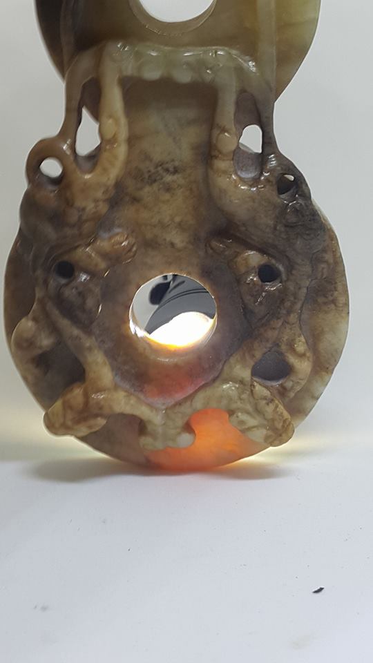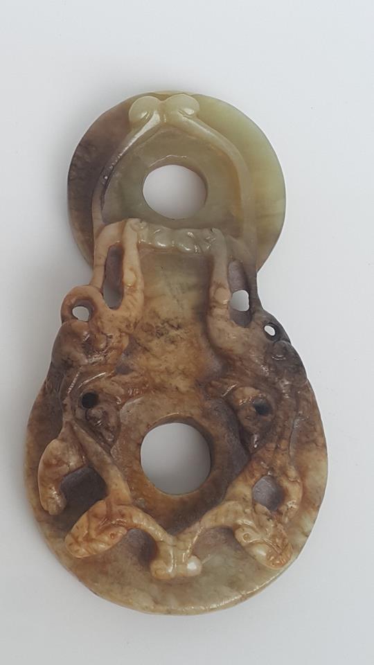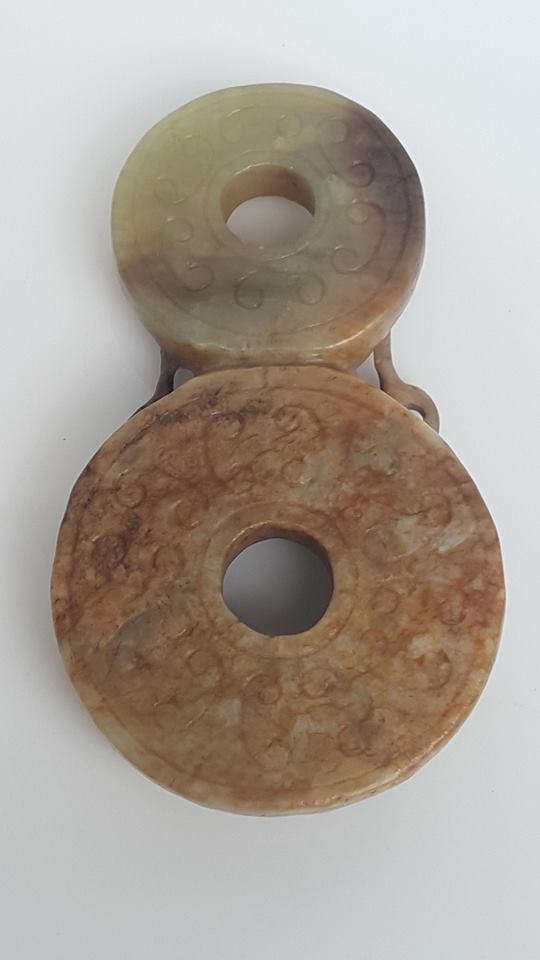 從出土的歷代古玉中發現、以黄玉雕琢成器的年代、屬明朝最多見、以今所展這件雙龍联璧、從型制、琢工分析應是明代玉匠以一塊帶有深淺黄色系的和田玉、設計成雙联璧、並在另一面雕有雙龍合掌之形式、這應代表異性双雄結盟之意、因自古工匠都有古玉定有型、有型必有有意之說。