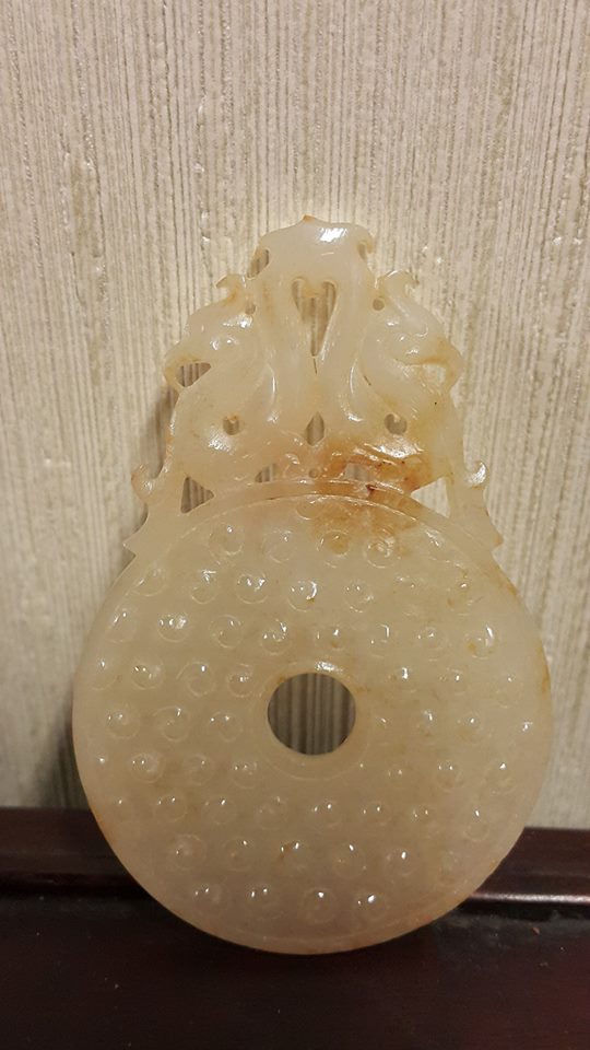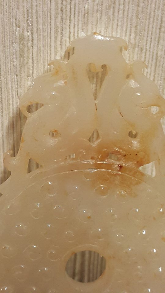 羊脂白玉、這名詞是鼎級和田白玉的代名詞、是以新疆和田地區出產的、和田玉籽料、中的精品為主要指標、目前市場普遍以和田白玉籽料為、羊脂白玉、其實是有点牽强、因羊脂白玉是以百分之九十八以上的透閃石結構、方能達到其等級、而通透度佳、硬度達6、5度以上。如以翡翠玉等級來比喻、類似玻璃種的程度、内部通透、油性好、。但並不以純白來獨稱、灰白和羊脂白的色系都有、但以紅皮籽料中出現的羊脂玉較為上等、其色系有如羊脂般的柔和感、。……西漢吕后的、皇后之璽、如第四張相片、、就是上等的羊脂白玉所雕琢、因密度高、固二千多年的物件受泌極少、。本館今日所展這件漢代雙鳳蚵蚪紋璧的玉質和色系、如同、皇后之壐、同塊料般的感覺、固從出土古玉中發現、歷代出現羊脂玉器應屬漢代、這也印証了漢代是華夏民族愛玉最鼎盛的朝代了。