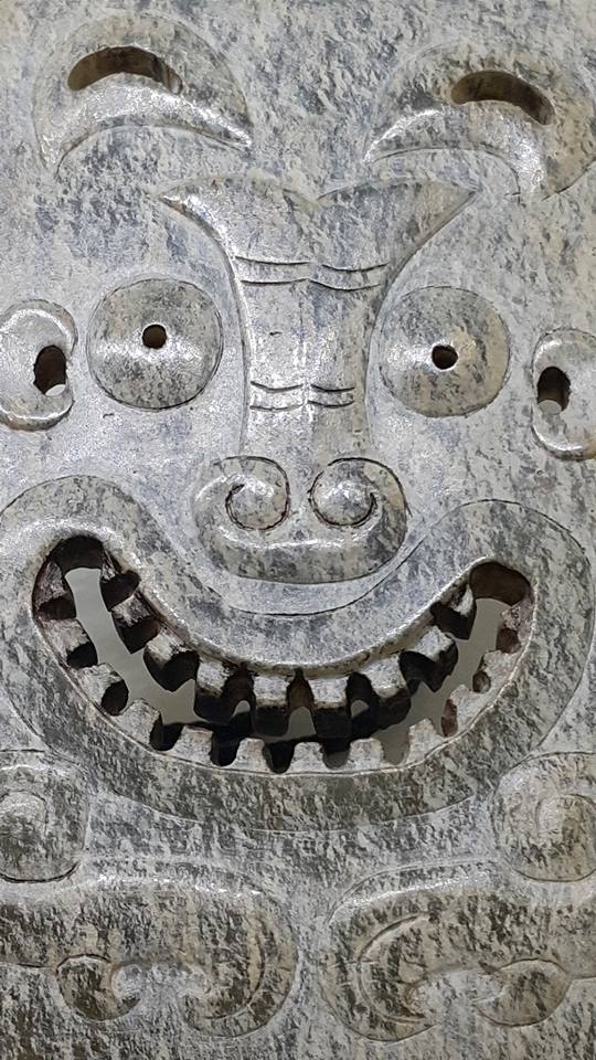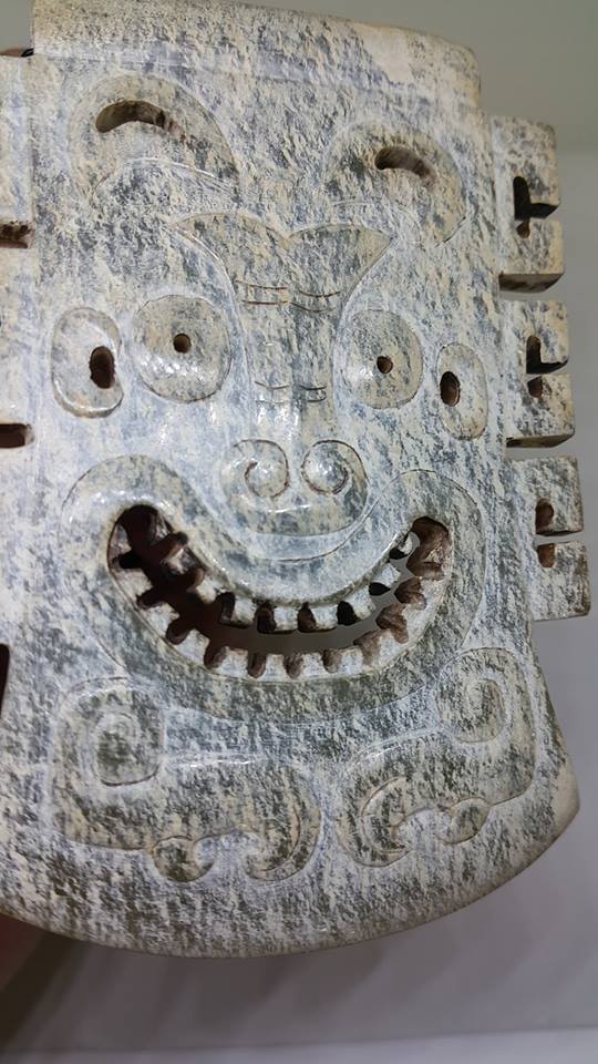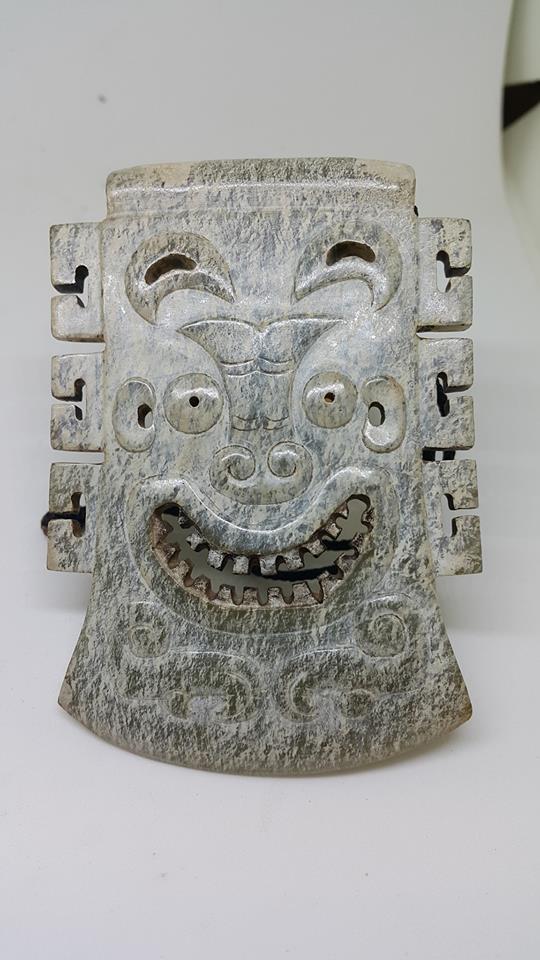 在華夏古國的商代、是發現以各種材料作臉譜最多也最精美的朝代、我們可從古蜀國的三星堆文化中得到証明、而今日所展這件以青玉雕琢的臉譜、其五官紋飾以陽雕琢成、表请生動、展露出喜樂之色、其琢工之精美、在商代的玉器中、可說極為少見。
