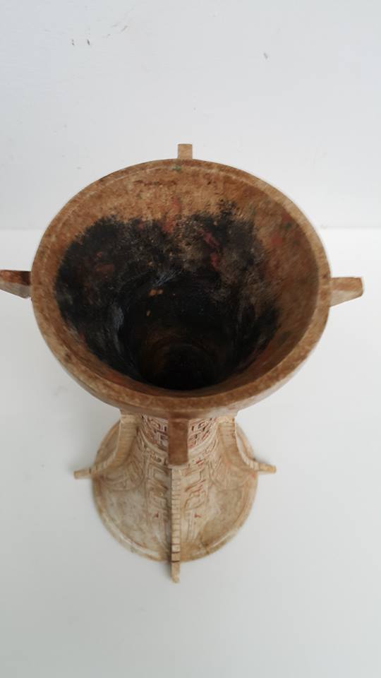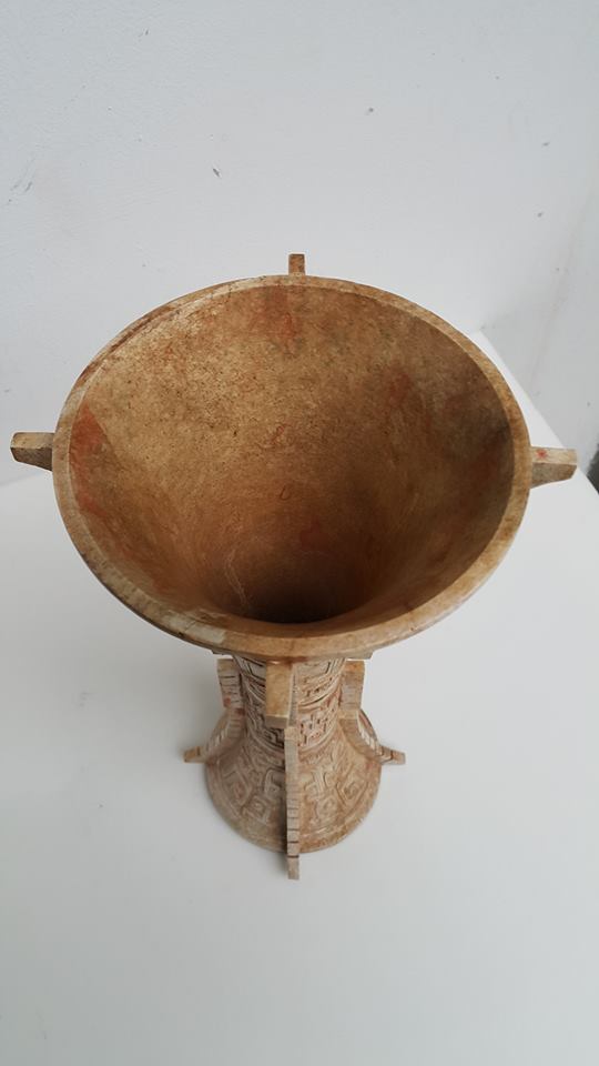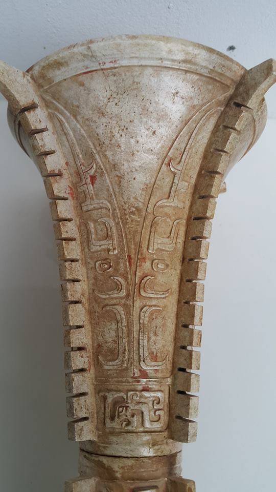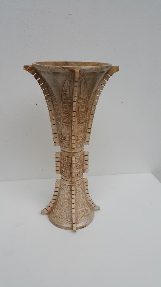 花觚之造型最早出現在華夏文明的商代、常見有以青銅鋳造的器物、以玉雕琢而成較為少見、當代此物件是作為酒器和水器、代表著中國古文明中禮儀文化的至高典範。……今日展出這件龍首鳳紋、通高28公分、其全器以高浮雕琢成、上半身為龍首和鳳紋、中部和圈足以鳳紋和捲體曲骨龍紋飾、充份體現其尊貴和古僕之風、值得欣賞