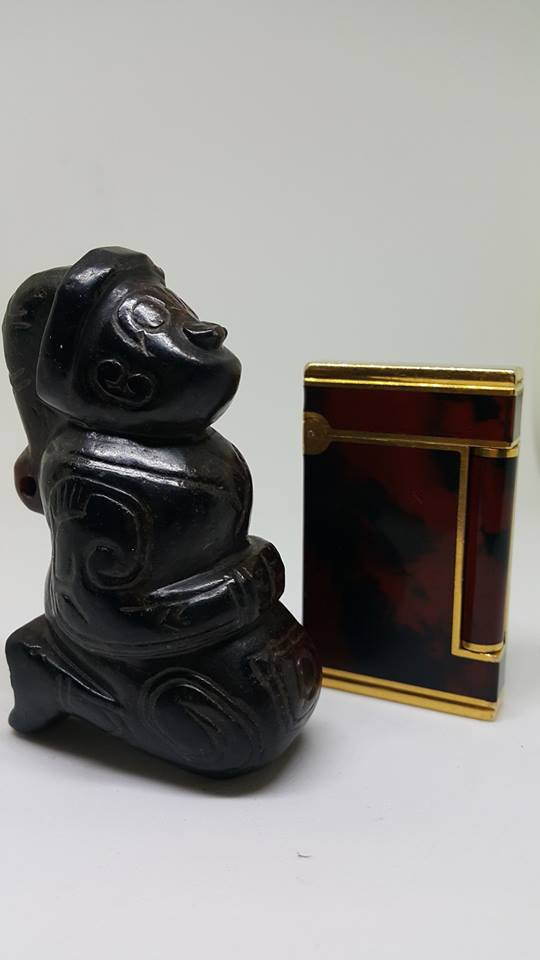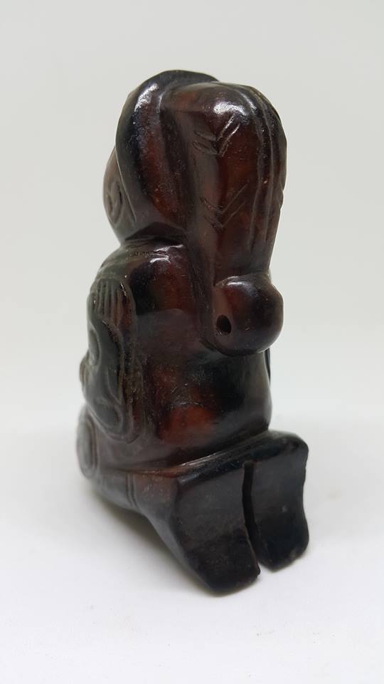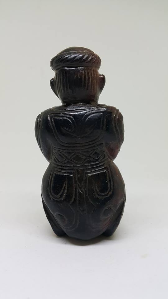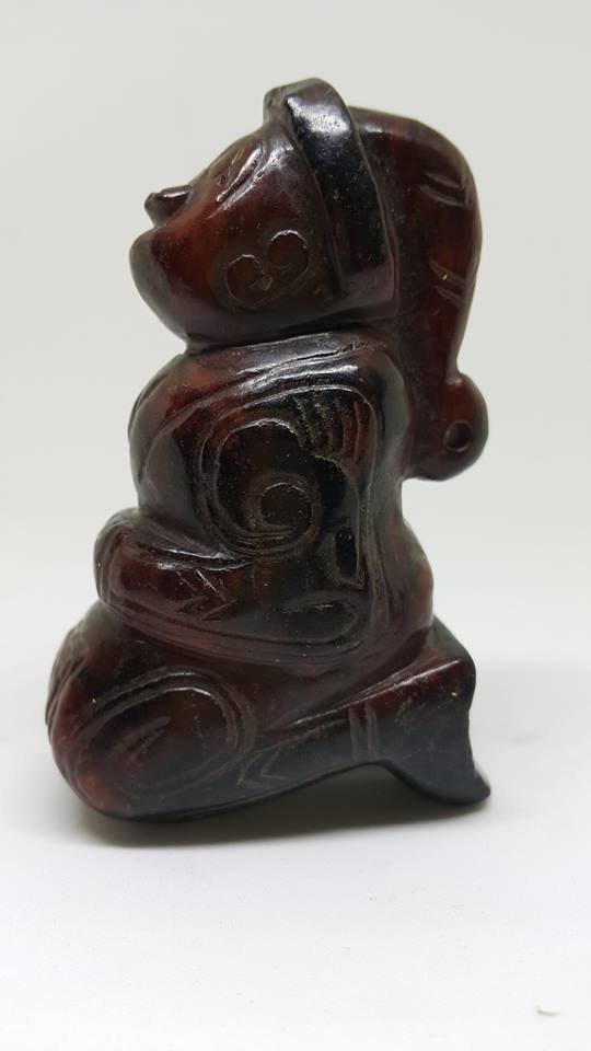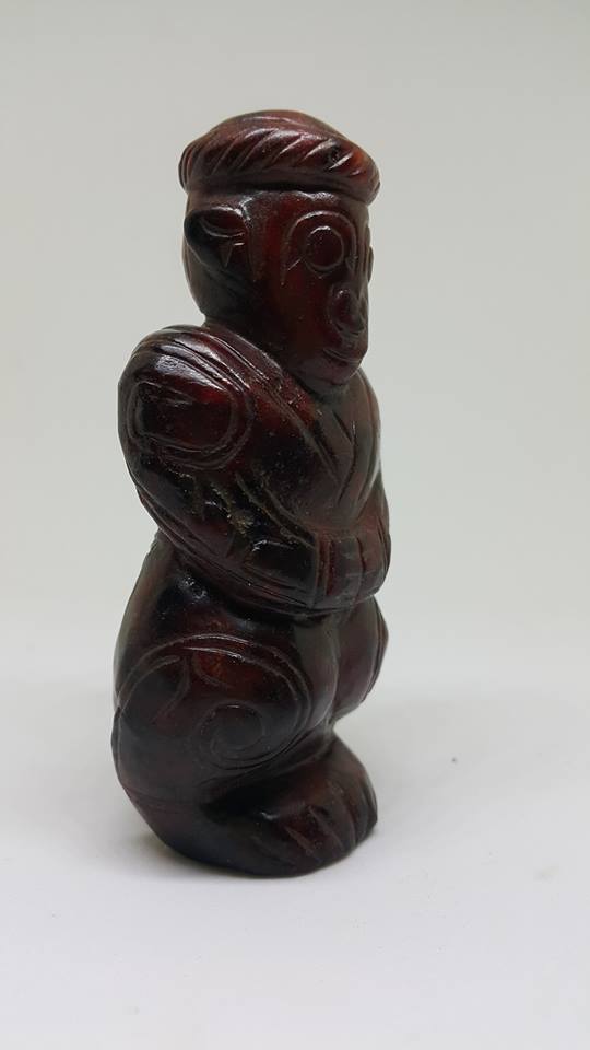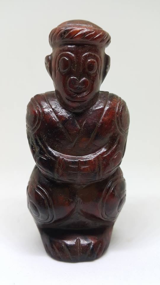 中國的神靈型象很早就出現在上古玉器的紋飾中、首先是神通廣大的動物和象徵天地的器物神、、人紋形象隨後逐步滲入、先是半人半獸、即氏族圖謄崇拜與氏族祖先崇拜相結合、表現神與人溝通、人與天結合、人開始帶有了神性、這是老三代玉器傳給後世子孫對人文的演變認知上最好的印証。……而今日本館展出這膝蹲式和跪式獸面人身的形制、其滿器受老紅土琥珀泌、再外加水銀泌、呈現底紅外黑現象、極為珍貴、可說是器優泌美之商代神物了。