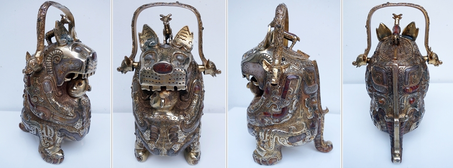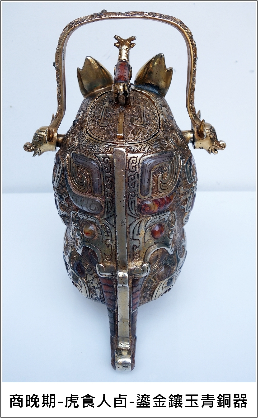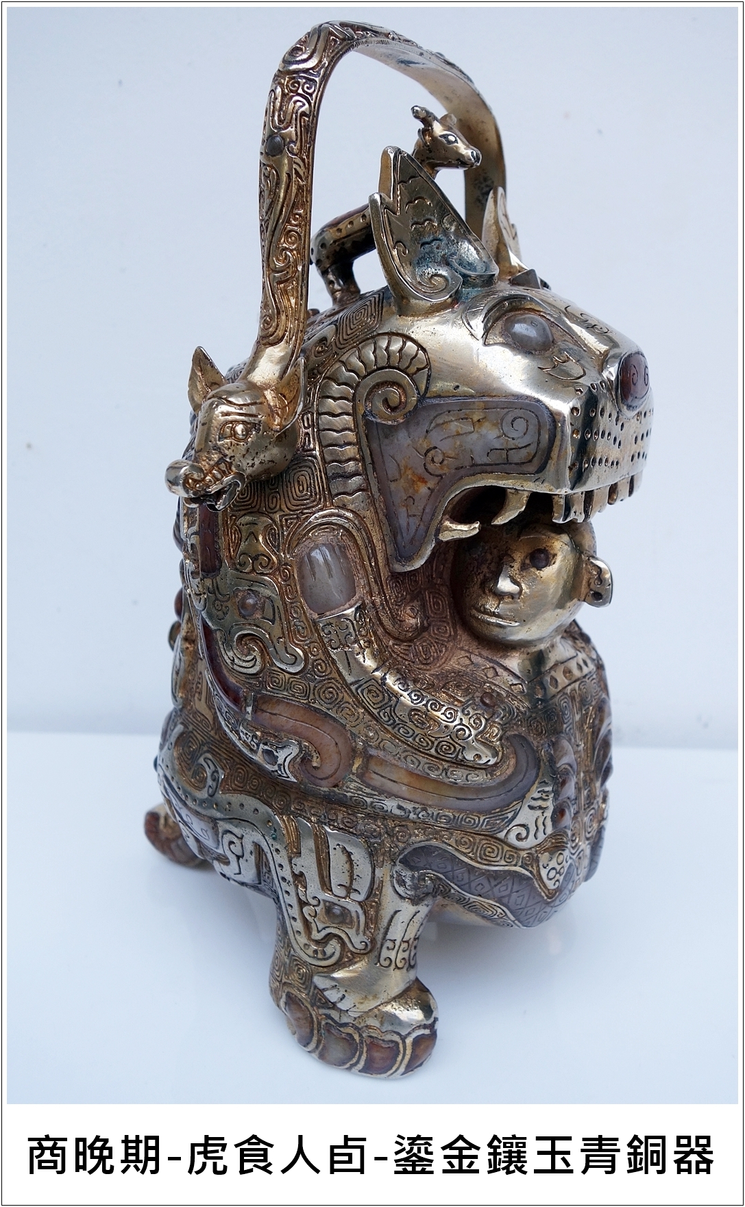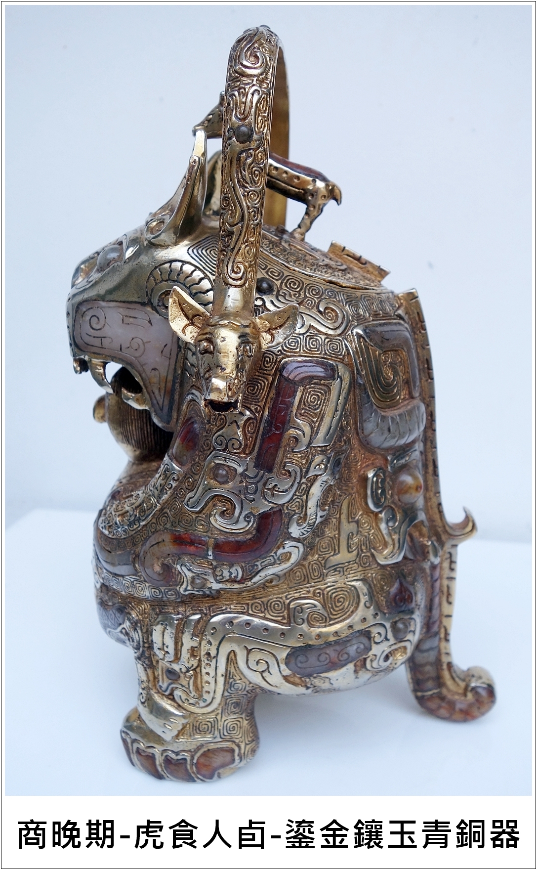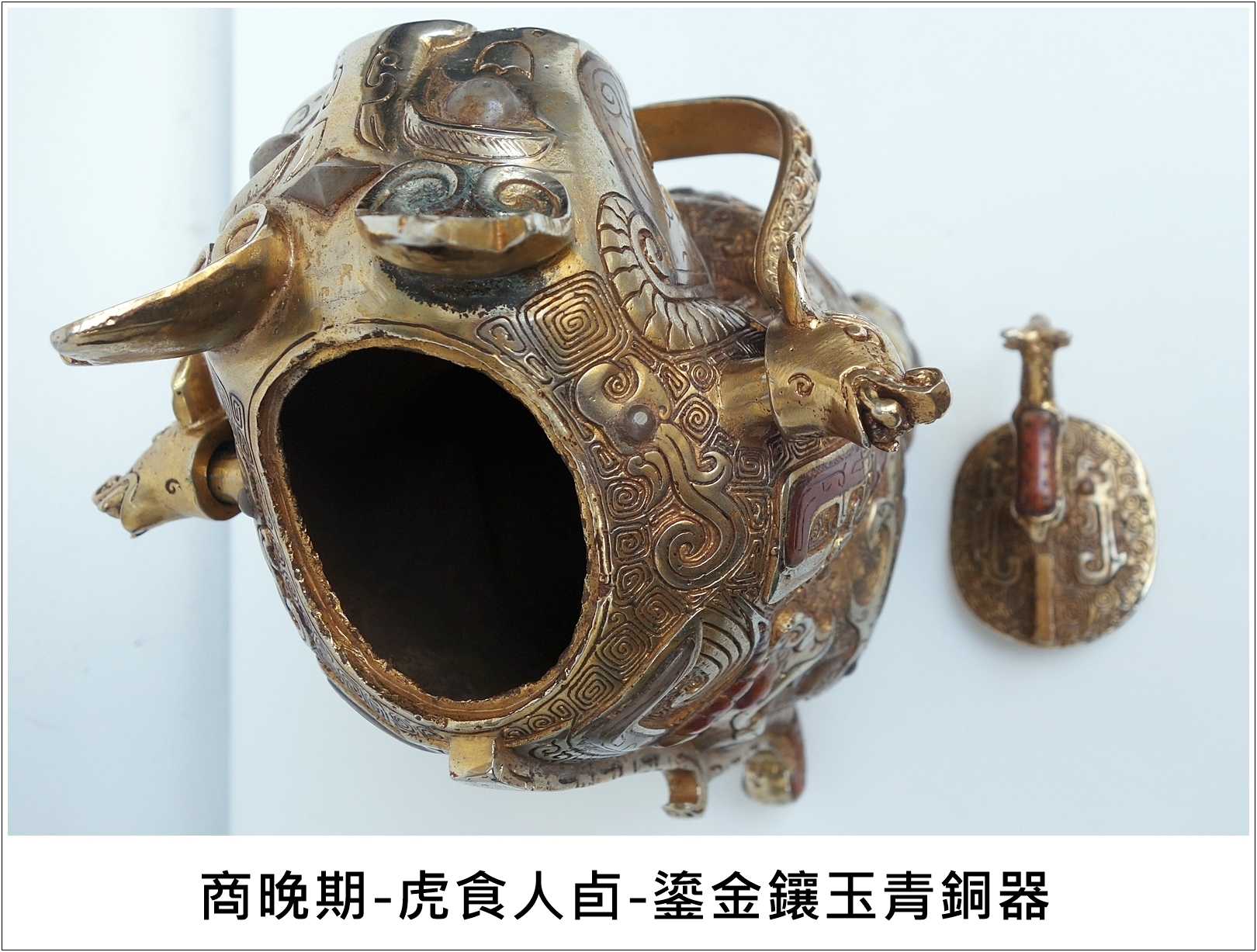 本館珍藏這件通高27公分、重3.07公斤的商代鎏金鑲玉虎食人卣,在商晚期出現,讓人稱奇,鎏金鑲玉之工法發現於春秋時期以後較多,像此虎食人卣器形複雜,在器物的異形條紋上饟玉,是極為精緻之工藝,比起流放到國外那兩件國寶級青銅虎食人卣的工藝和等級,應更上乘,可屬極品中的極品。