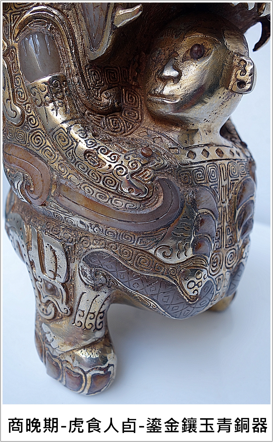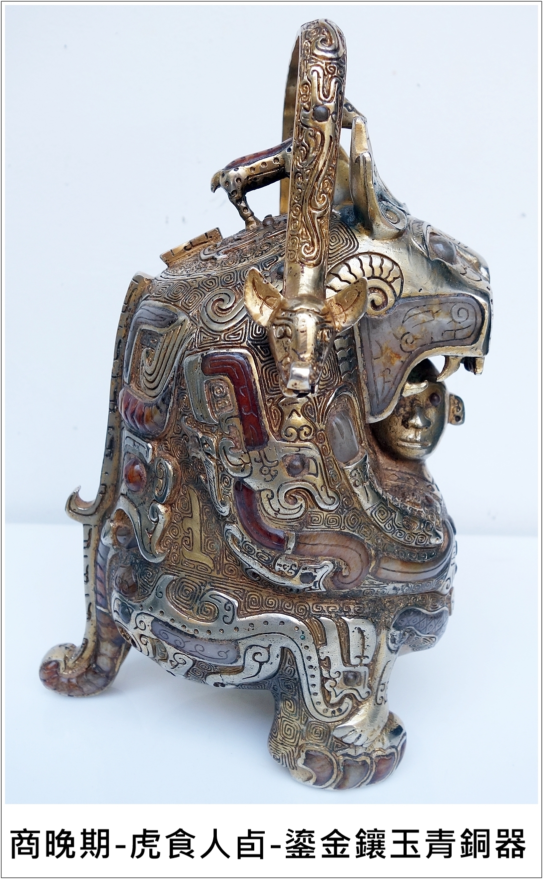 商晚期-虎食人卣-鎏金鑲玉青銅器