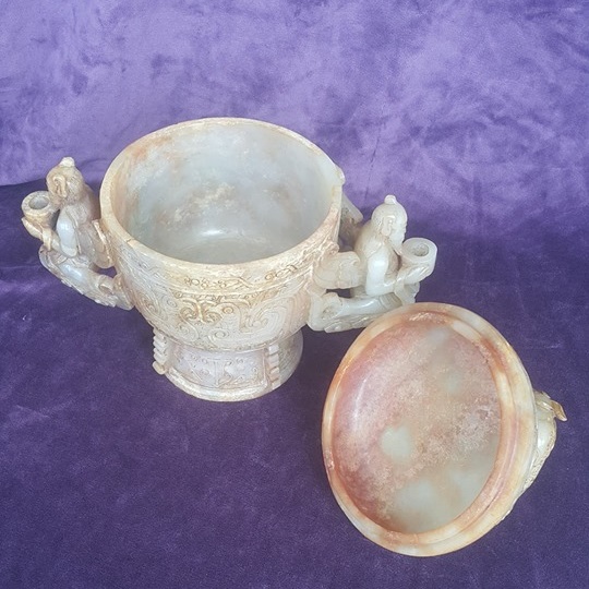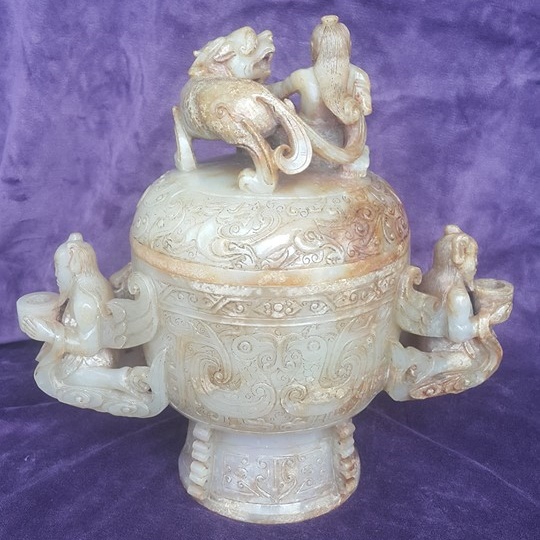 此件充滿道教色彩玉罍,其特別引人好奇的是在蓋紐的道人抓住龍鬚的舉動,從古至今龍是代表至高無上的象徵,在這件玉罍上竟呈現龍被道人所征服,甚是奇特,而我們可從形制來詮釋這件玉罍的背景。