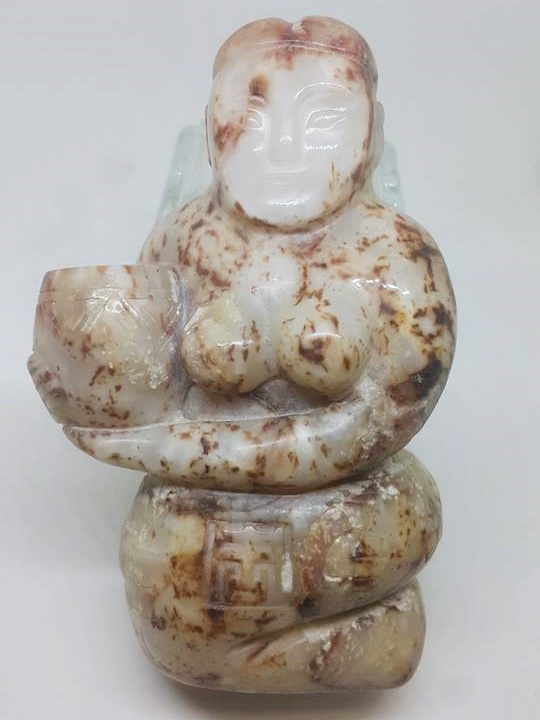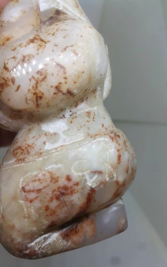 從今日所展這2件以羊脂白玉雕琢的裸身陪浴侍女雕像,其雍容體態和下身刻有7個古文字,應是記戴著某種典故。而此種規格的葬玉,應非皇陵莫屬了。