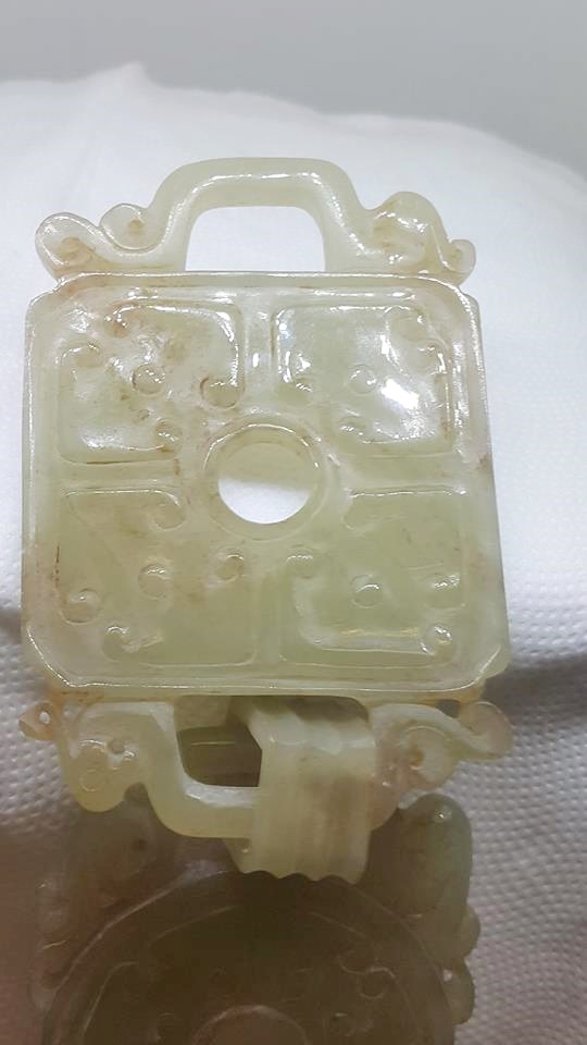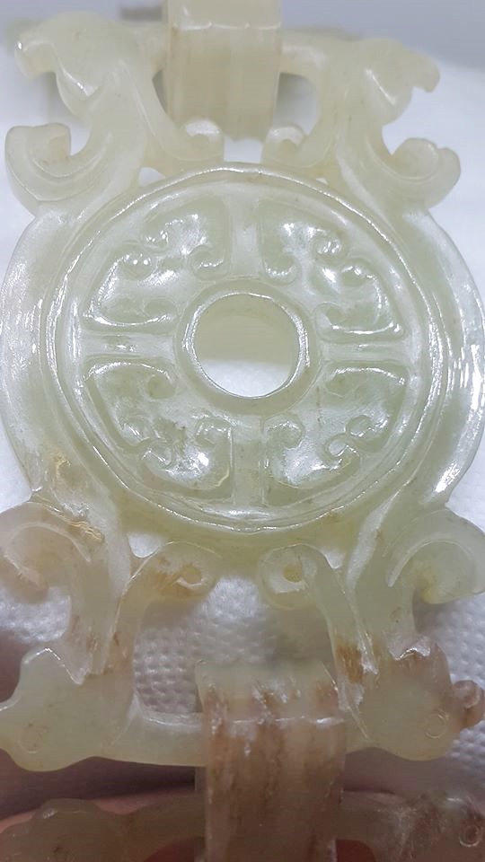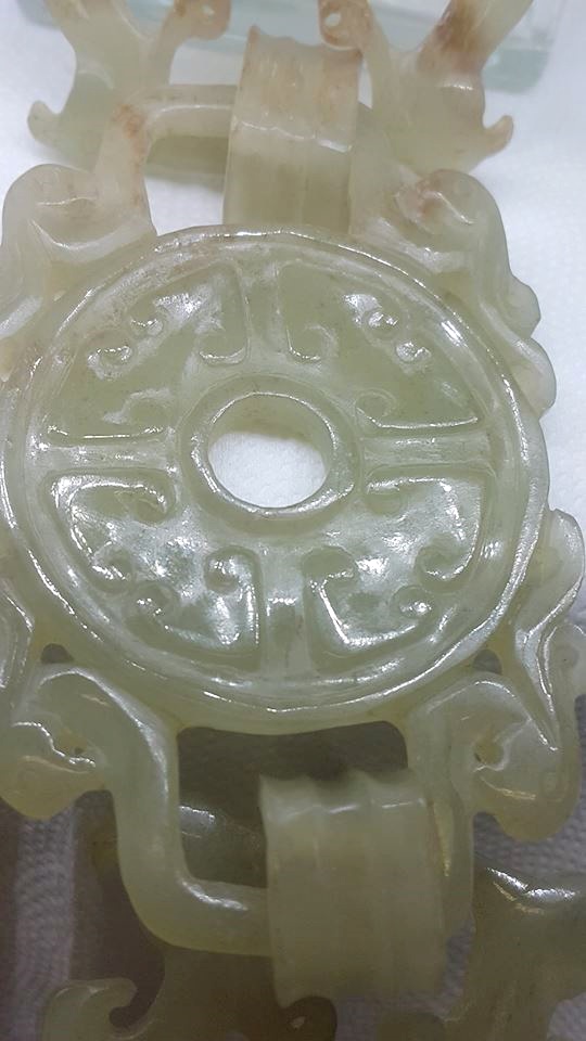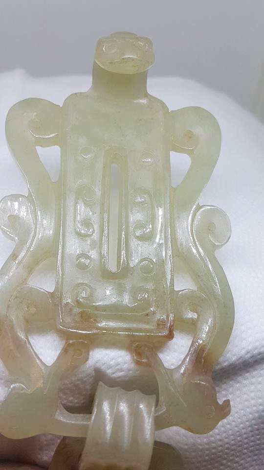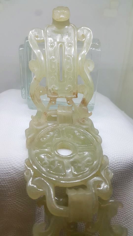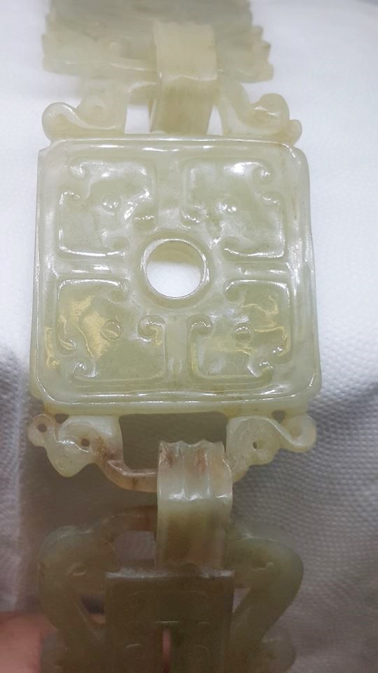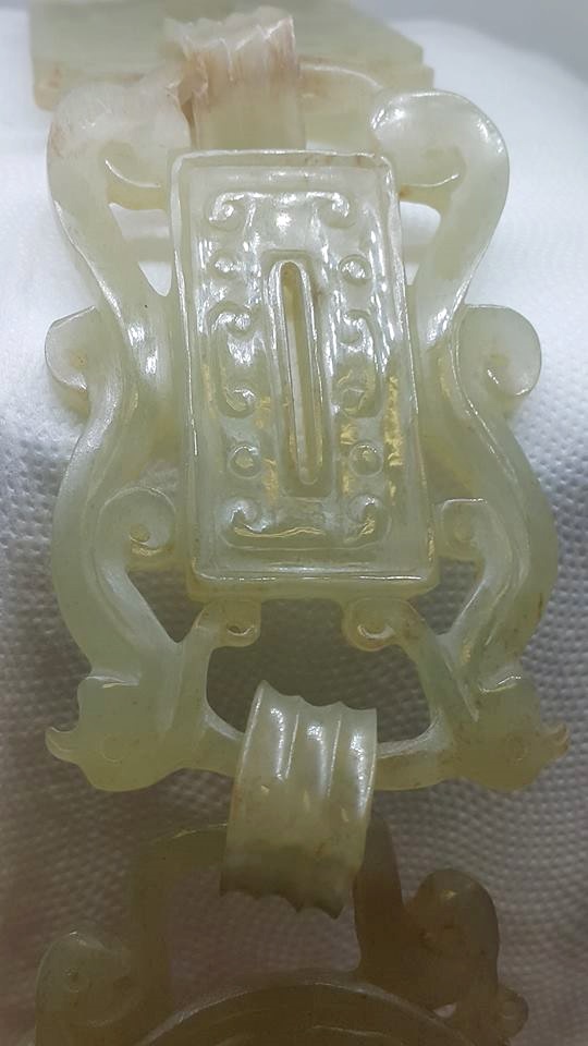 明史記戴-明朝一品官員或王侯方能配玉腰帶,而今日這件以整塊和田黃玉雕琢而成的玉帶,總長147公分並分21片勾連而成。從每片以龍鳳環繞勾雲紋的型制可看出,應屬王族配帶之物;而史記中也提到,身份越高,玉帶片數越多越長,故今日所展這件以21塊玉片組成的玉帶,在所有館藏中,尚屬少見,尤以同塊玉料雕琢而成的工藝,更是精湛、值得大家共賞。