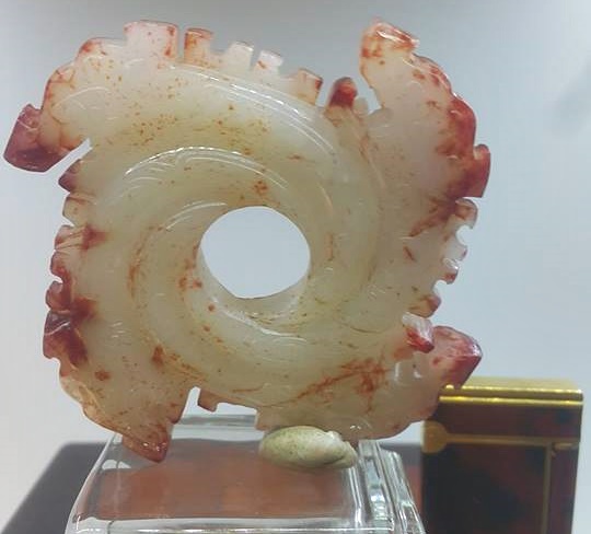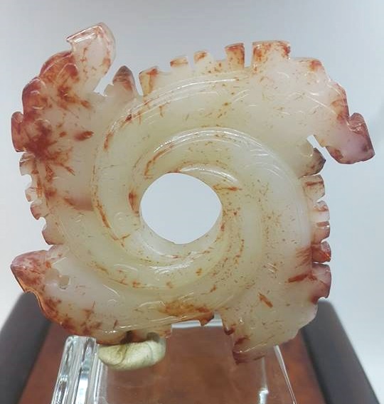 壓旋璣早在史前的紅山文化玉器中即己出現,而後在中原的黃河流域文化中也都有其蹤跡,但杳遍史記,對其物件的寓意就有多種版本,而本館認為從商周以後的玉旋璣物件末端都以獸形飾之,至戰漢以後,旋璣極為少見,取而代之的乃以玉璧外圈周圍飾有3-4個動物形制,如<龍,老鼠等>其寓意為<望子成龍>。故今日對此件商代龍形玉旋璣的詮釋,本館認為其寓意應是<龍族輪迴>意思是希望物件主人配帶此物能讓其王位代代相傳之意。