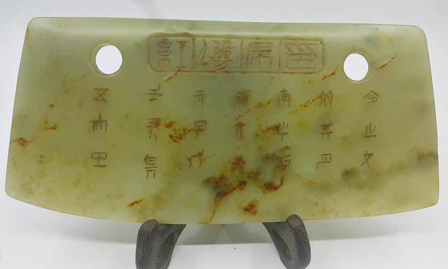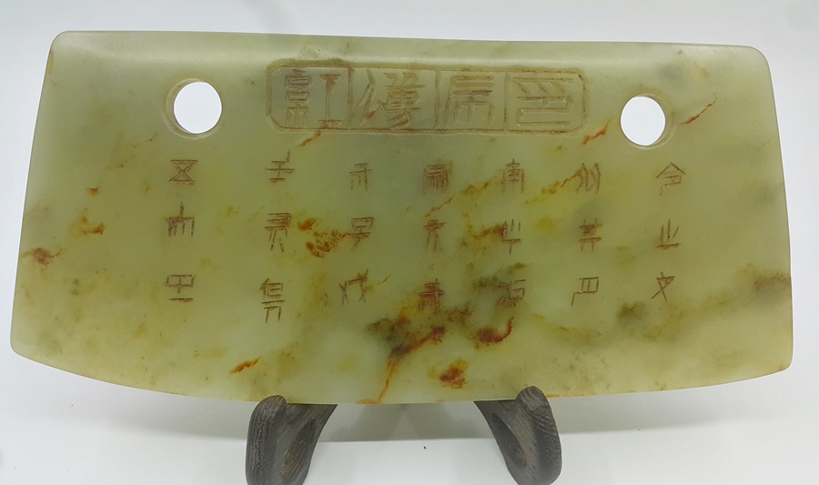 在黃河流域文化中,甘肅的齊家文化和山東的龍山文化是出土玉刀較多的地方,也是代表當代的典型玉器,其玉刀從單孔至七孔都出現過,其長度越長孔數就越多,目前出世的玉刀,以七孔為最。而在玉刀上刻有古文的物件,極為少見,如今日所展這件二孔玉刀從器體上所留下的古文字看來,應是王族的重要印証信物。