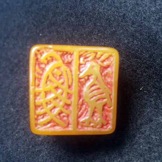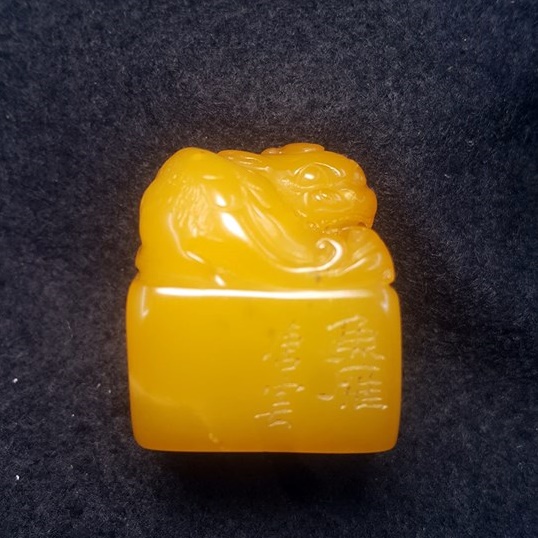 本館今日所展這件田黃凍,乃民初名畫家<唐雲>之魚雁閒章,並有唐雲、落款,通高2.6公分,重30克,請大家鑑賞。