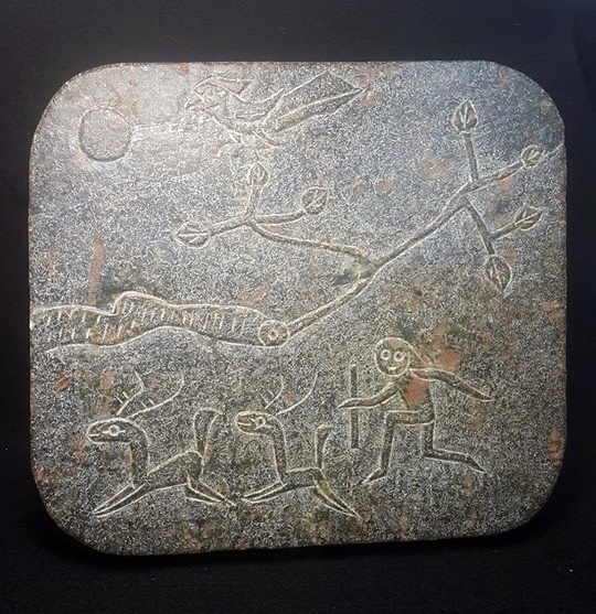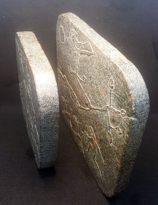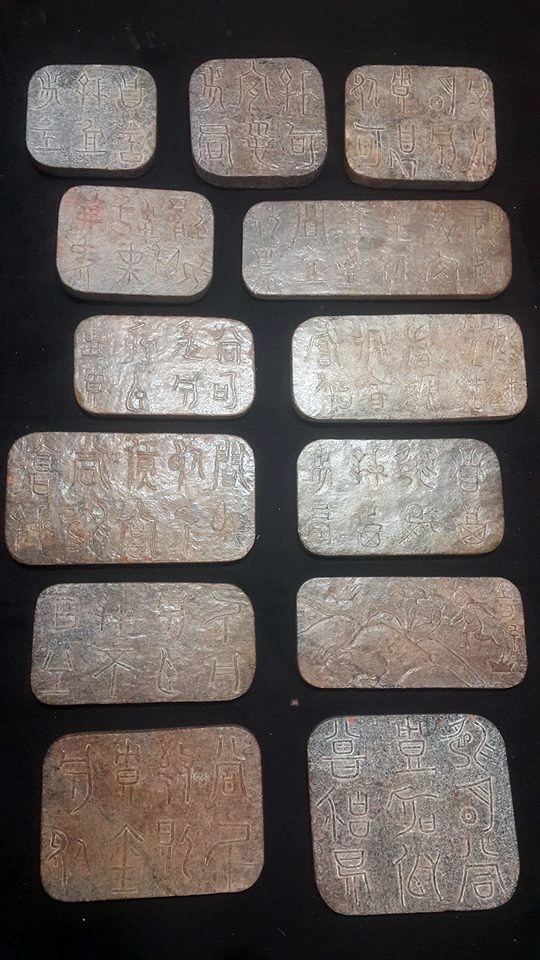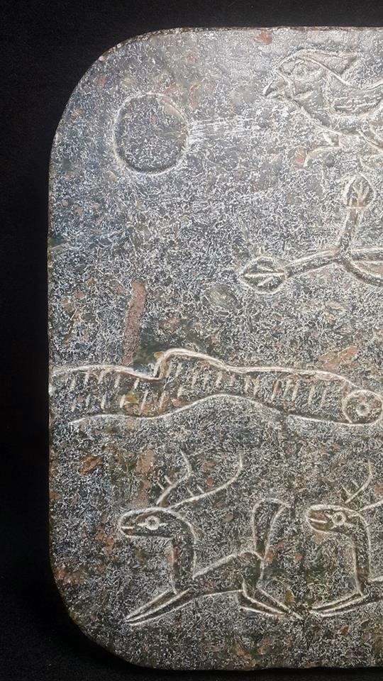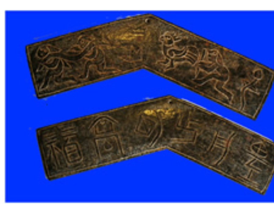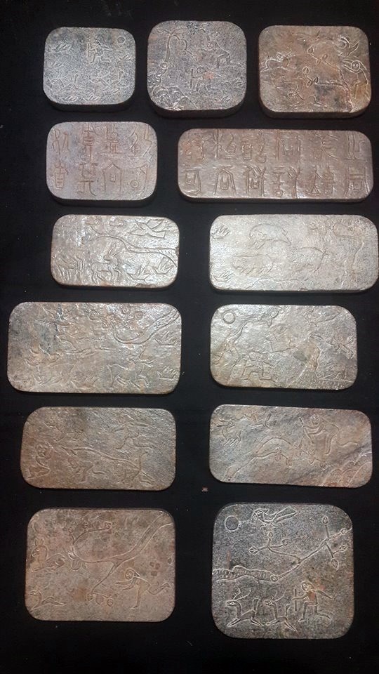 而根據本館珍藏這套共13片的玉磬書,它是以各種大小不同的壁玉板塊,以起地陽雕工法,一面琢出各式的狩獵和動植物圖謄,另一面雕琢著古老史前的圭文,像是在細訴圖騰含義;而玉板上並未出現打孔現象,固本館分析,此套玉磬書,應是純粹為文字留傳所製作。故可確定在夏代以前,我們的祖先就有以玉器來製作書本和樂器了。