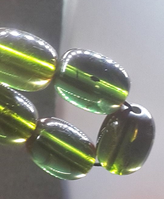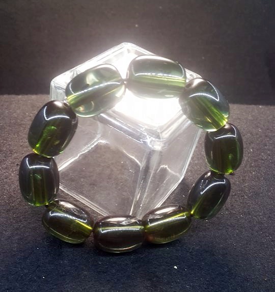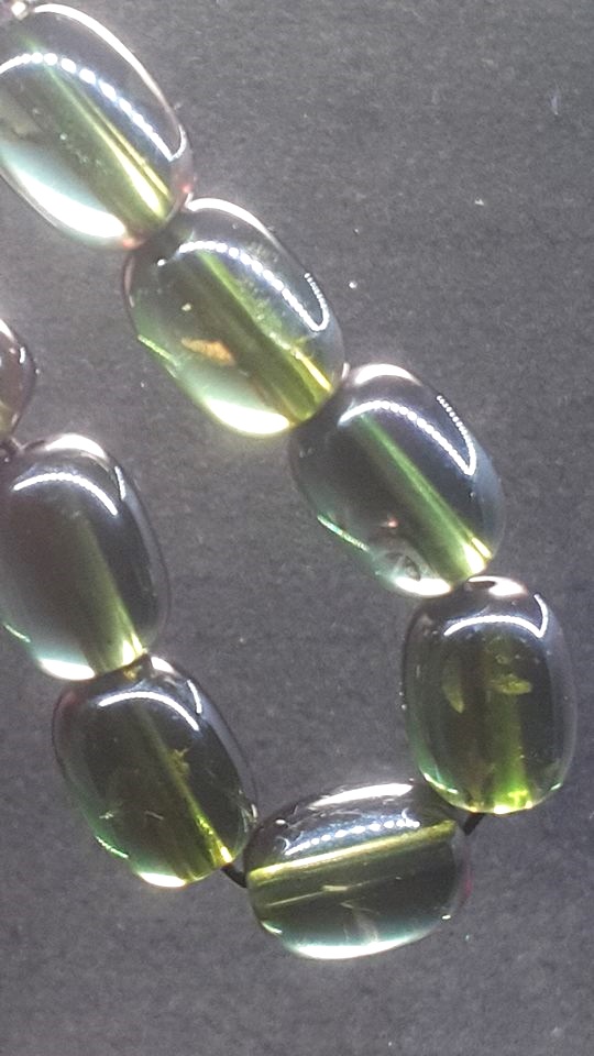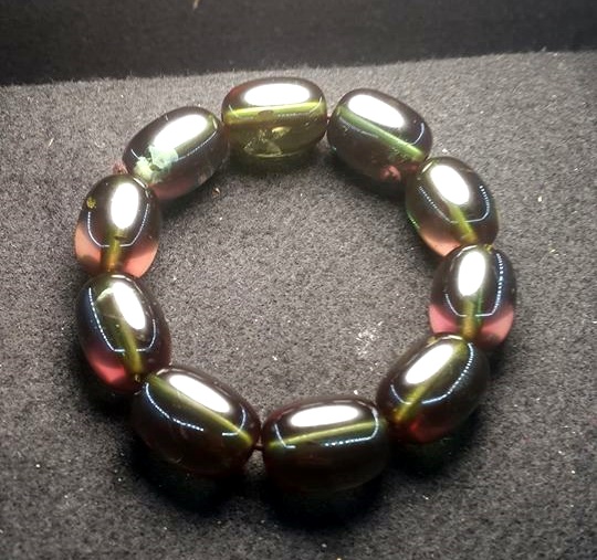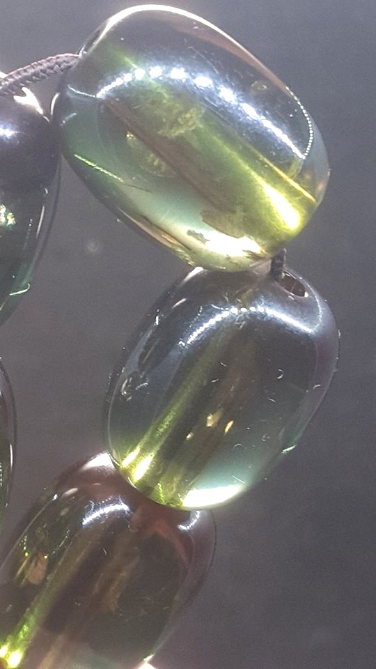 但目前琥珀產品,在市場上有很多人工仿品幾可亂真,今日本館特別展出這件綠珀手串,我們除可清楚的看到物件本身即有的三個色系顏色外,而在琥珀肌體內有明顯的雜質和自然爆花現象,這是証明天然琥珀的方法之一,提供大家參考。