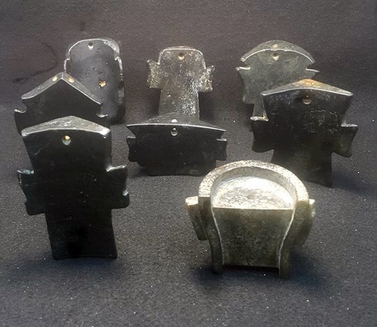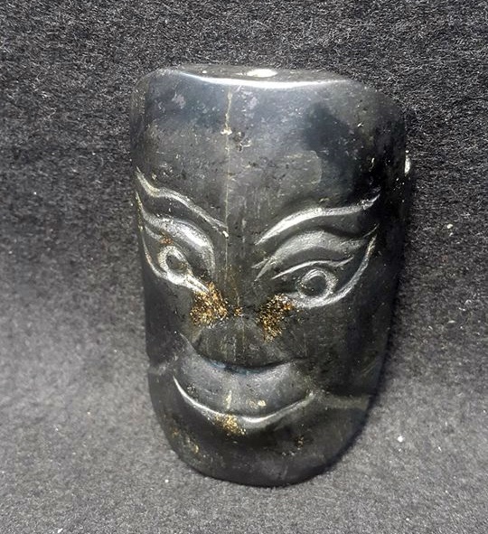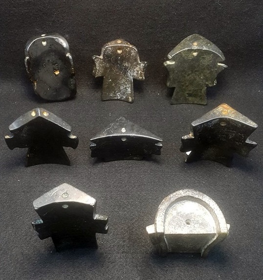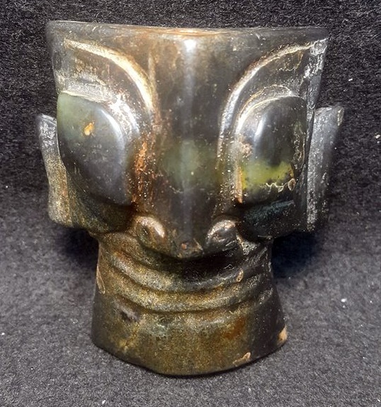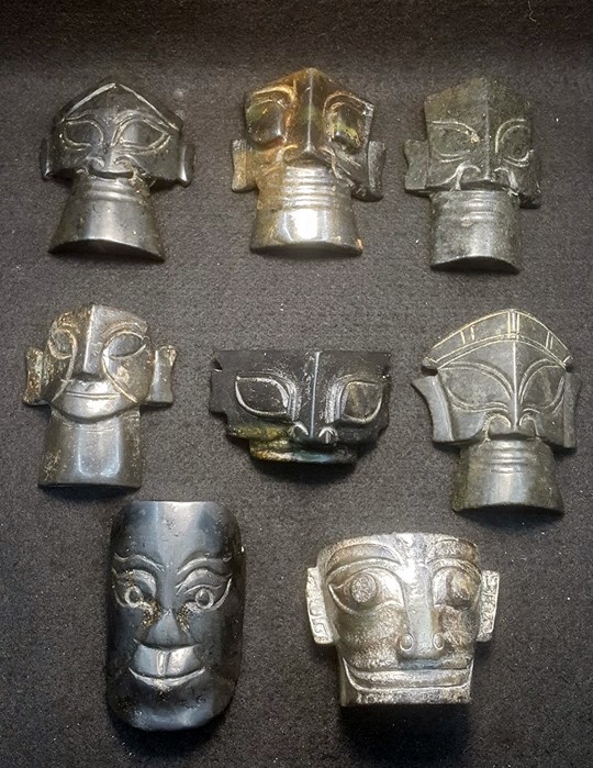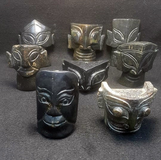 今日本館所展這六件以汶川龍溪玉所雕琢的各式臉譜玉雕件可發現,早在三、四千年前的巴蜀古人,就以各種造型的臉譜藝術來展现其獨樹一格的文化特色。