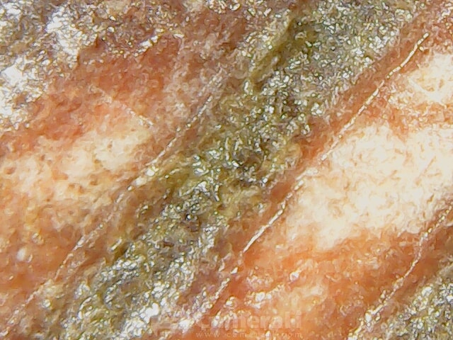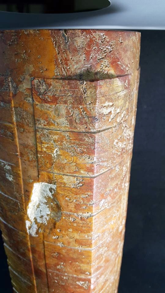 表層受到大部份的硃砂侵澨以至千瘡百孔,