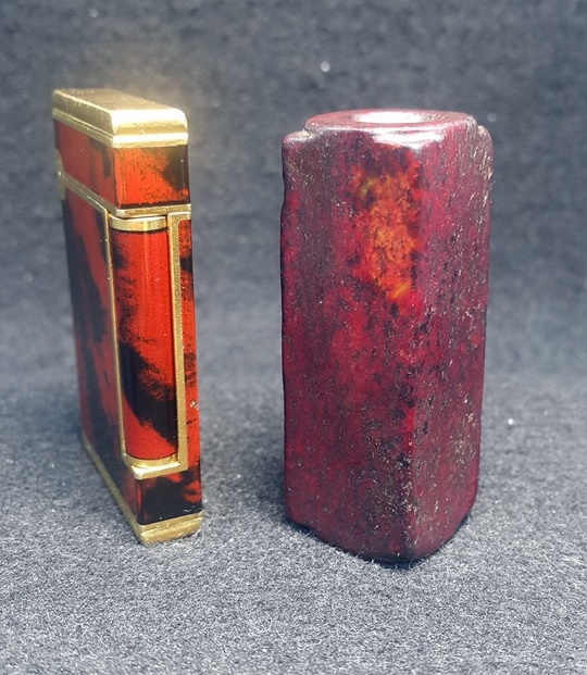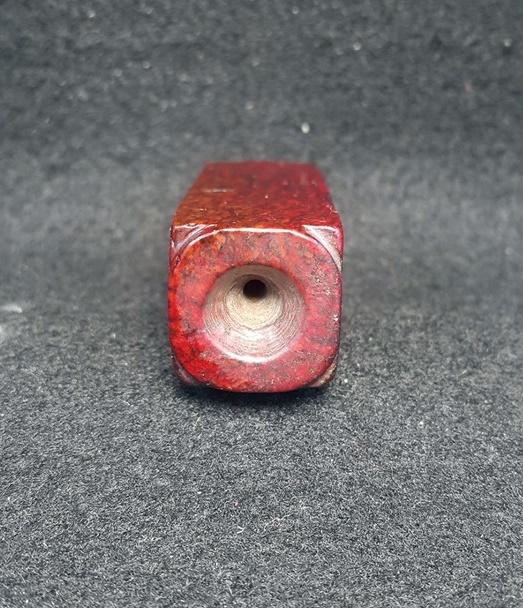 從今日這件素面小玉琮來觀察,宫庭玉匠以紅玉為材料,