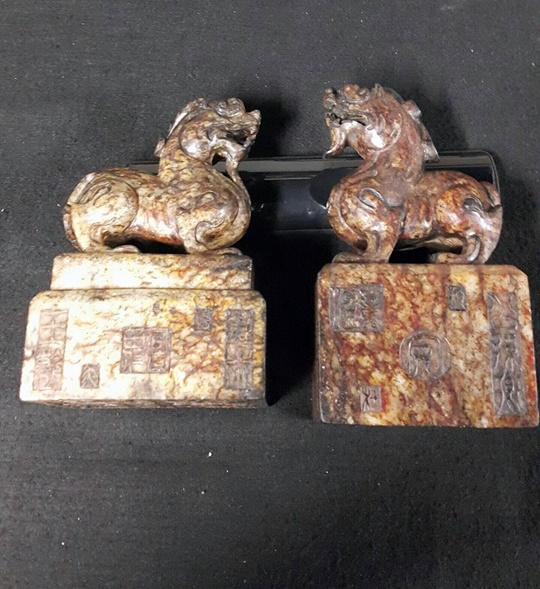 如今日所展這對俗稱<避邪>的雌雄瑞獸,其獨角特徵和帶有雙趐的造型,