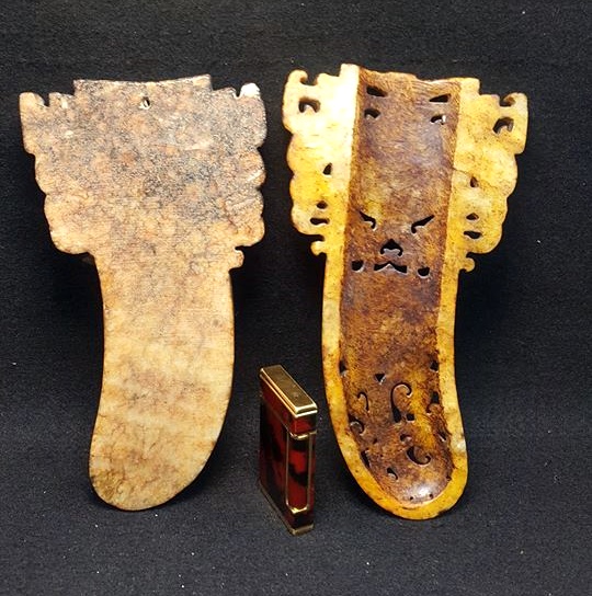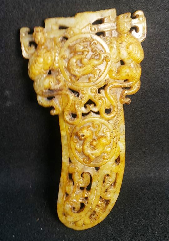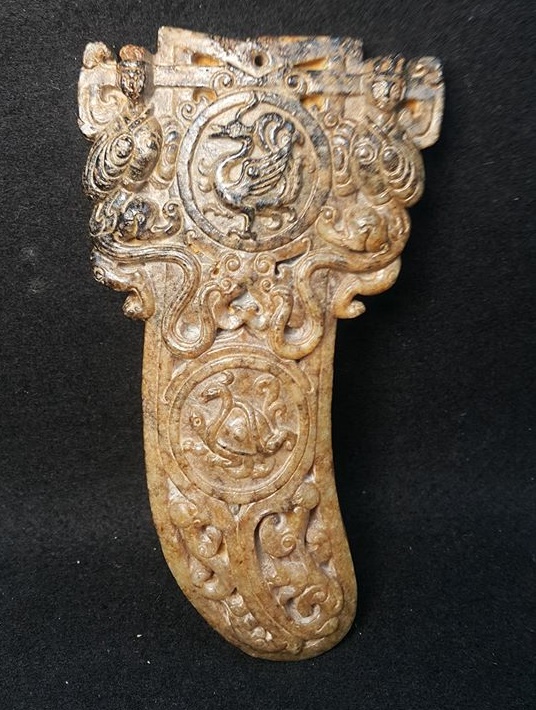 如同本館今日所展出的這件玉劍柄器,其以青龍白虎和朱雀玄武為中心,頂上以帽型的獸面紋飾,兩側有獸身神人首作為護法,整器紋飾莊嚴霸氣,突顯鎮刹之神器。