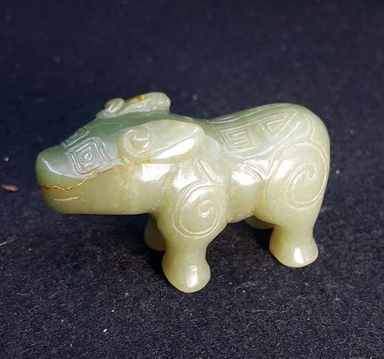 從出土的商周時期玉豬雕件中,都以卧式和蹲式為主。如今日所展這件以立姿設計的玉豬雕件,
