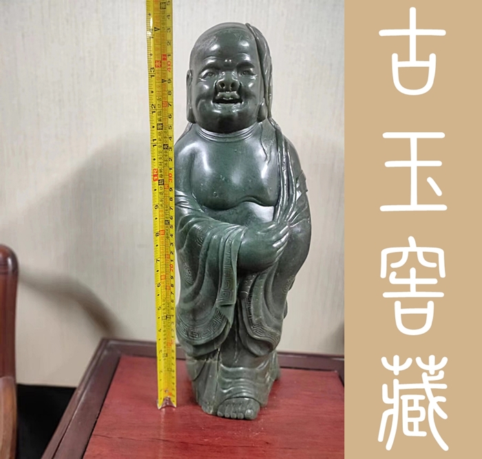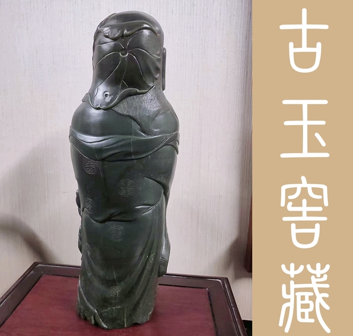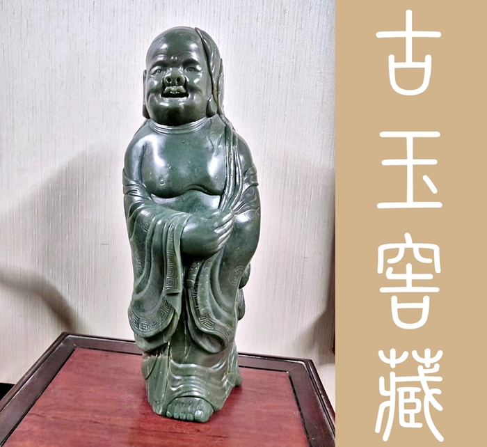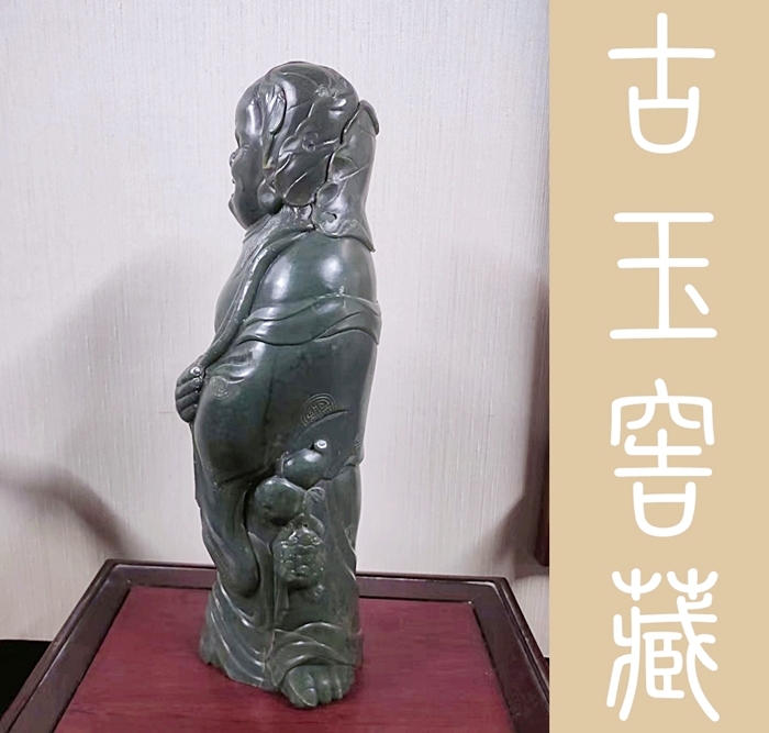 劉海乃中國傳統文化中的『福神』。金蟾為仙宮靈物,古人以為得之可至富,更有流傳,劉海戲金蟾,步步釣金錢之說。表示財源廣進,大富大貴之意,故在雕琢肖像時,工匠對其規格也極為講究,如本館今日所展這尊劉海戲金蟾玉雕,其通高44公分,乃財德兼備之吉利尺寸。而全身展現出貴氣和喜氣外,其神韻和神態的自若表現,應是出於高級的玉匠之手。