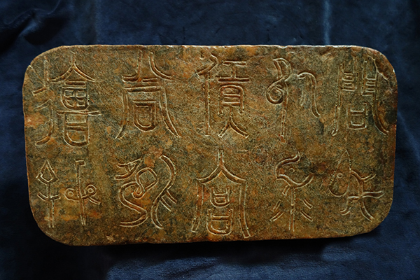 P5 年代: 甘肅文化 品名: 文字玉板塊 玉料: 青玉 規格(寬×高×厚-公分): 34×13×2