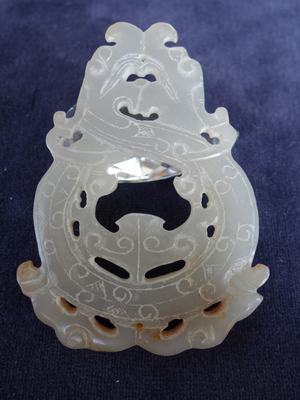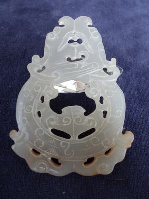H14 年代: 漢 品名: 雙龍璧 玉料: 白玉 規格(寬×高×厚-公分): 5.5×8.5×0.5