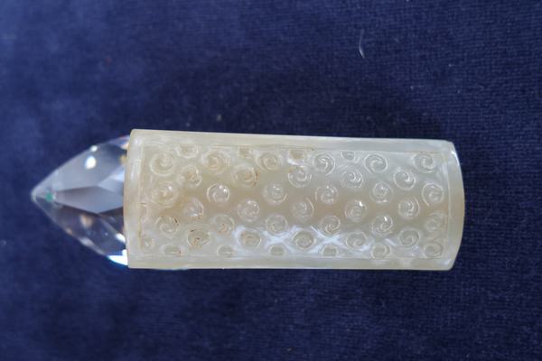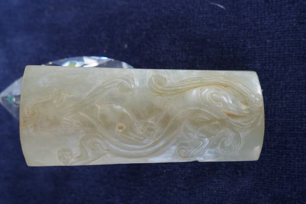 H19 年代: 漢 品名: 玉勒子 玉料: 青白玉 規格(寬×高×厚-公分): 2.5×6×1