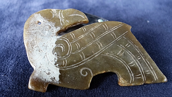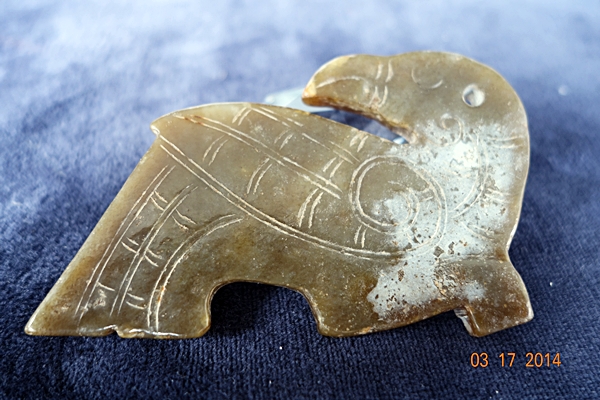 D6 品名: 玉鳥珮 玉料: 和闐青玉 規格(寬×高×厚-公分): 8×4.5×0.4