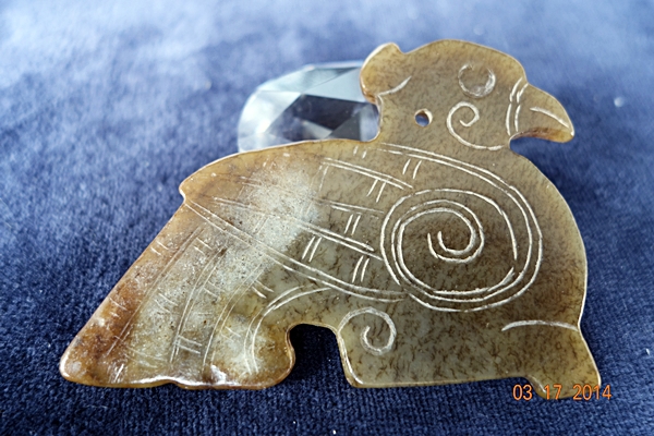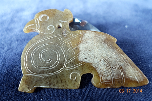 D7 品名: 玉鳥珮 玉料: 和闐青玉 規格(寬×高×厚-公分): 7×5×0.4
