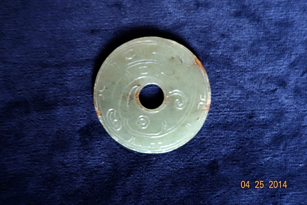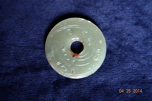 D102 年代: 商 品名: 玉璧 玉料: 青玉 規格(寬×高×厚-公分): 直徑 5.2×0.4