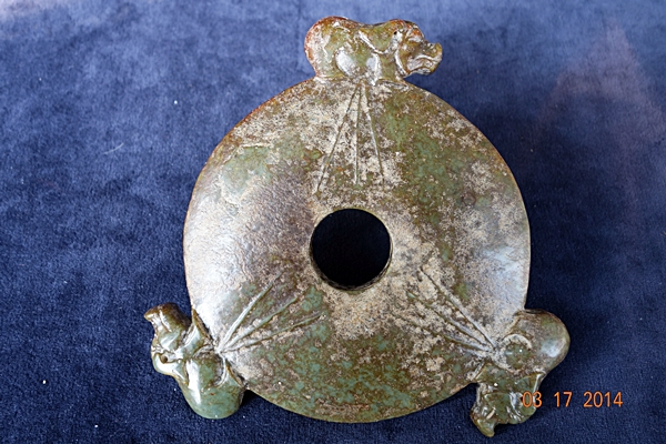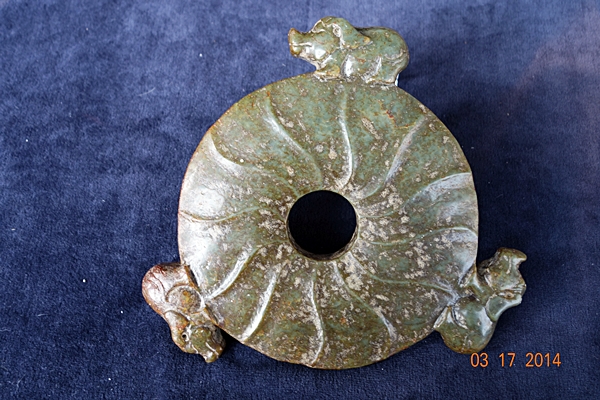 D115 年代: 商 品名: 三豬璧 玉料: 青玉 規格(寬×高×厚-公分): Ø17×1.8