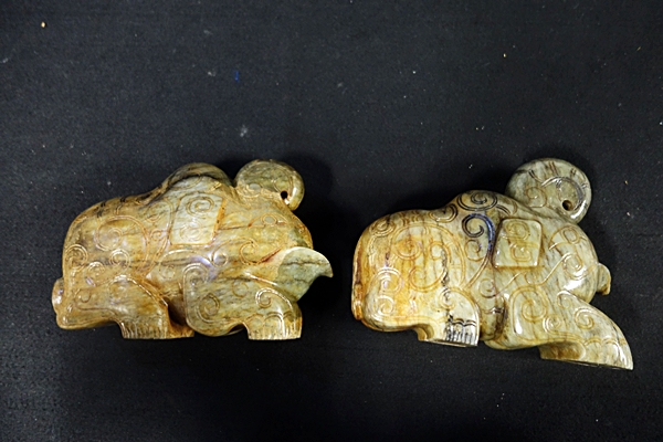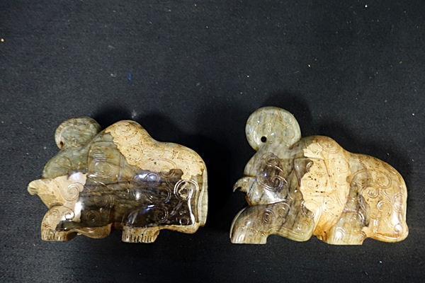 D118 年代: 商 品名: 雄雌玉象 玉料: 青白玉 規格(寬×高×厚-公分): 19×8.5×13(2只)